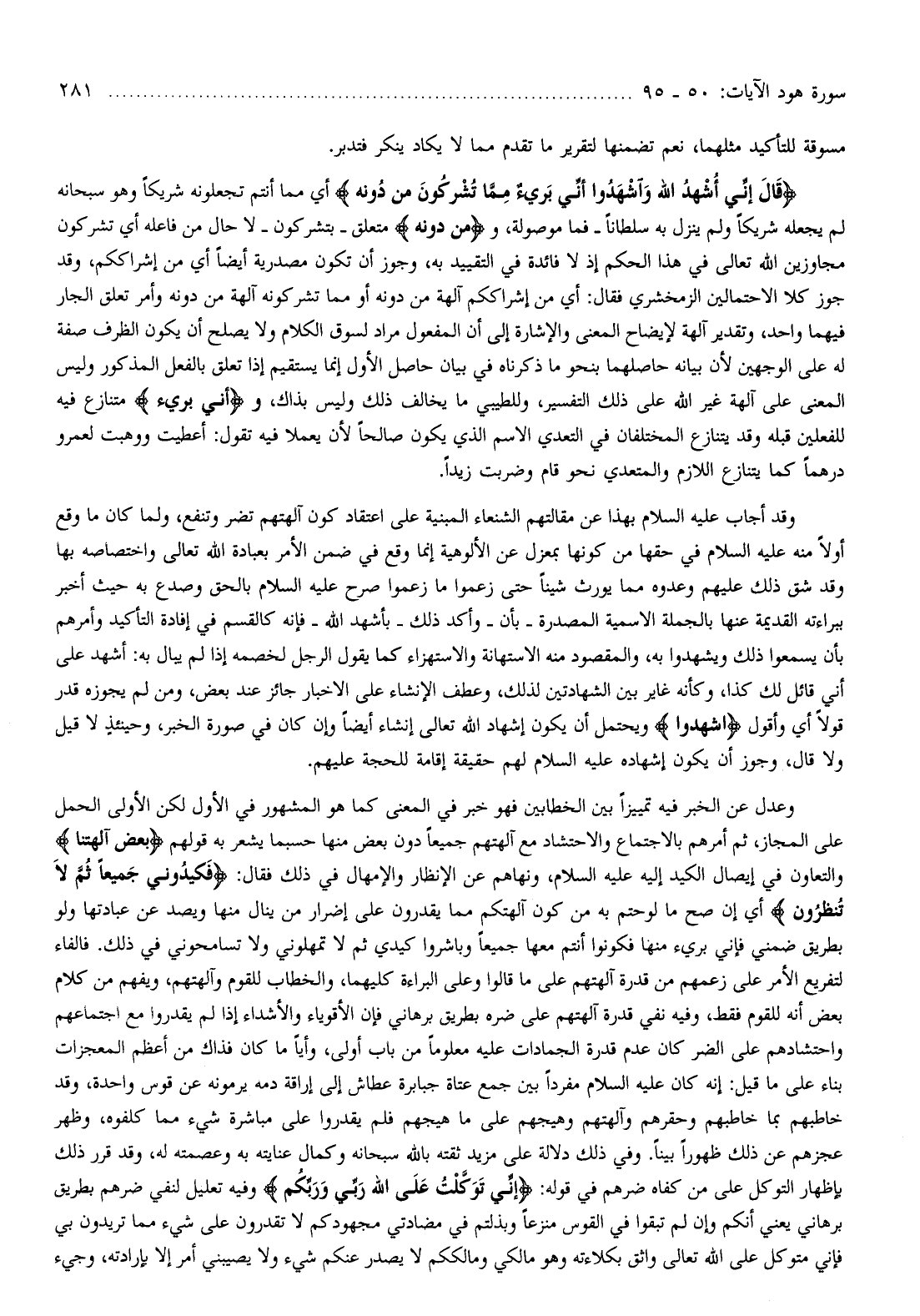 قالَ إِنِّي أُشْهِدُ اللَّهَ وَاشْهَدُوا أَنِّي بَرِيءٌ مِمَّا تُشْرِكُونَ مِنْ دُونِهِ أي مما أنتم تجعلونه شريكا وهو سبحانه لم يجعله شريكا ولم ينزل به سلطانا- فما موصولة، ومِنْ دُونِهِ متعلق- بتشركون- لا حال من فاعله أي تشركون مجاوزين الله تعالى في هذا الحكم إذ لا فائدة في التقييد به، وجوز أن تكون مصدرية أيضا أي من إشراككم، وقد جوز كلا الاحتمالين الزمخشري فقال: أي من إشراككم آلهة من دونه أو مما تشركونه آلهة من دونه وأمر تعلق الجار فيهما واحد، وتقدير آلهة لإيضاح المعنى والإشارة إلى أن المفعول مراد لسوق الكلام ولا يصلح أن يكون الظرف صفة له على الوجهين لأن بيانه حاصلهما بنحو ما ذكرناه في بيان حاصل الأول إنما يستقيم إذا تعلق بالفعل المذكور وليس المعنى على آلهة غير الله على ذلك التفسير، وللطيبي ما يخالف ذلك وليس بذاك، وأَنِّي بَرِيءٌ متنازع فيه للفعلين قبله وقد يتنازع المختلفان في التعدي الاسم الذي يكون صالحا لأن يعملا فيه تقول: أعطيت ووهبت لعمرو درهما كما يتنازع اللازم والمتعدي نحو قام وضربت زيدا.
