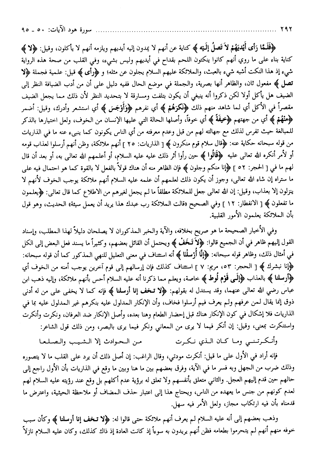 فَلَمَّا رَأى أَيْدِيَهُمْ لا تَصِلُ إِلَيْهِ كناية عن أنهم لا يمدون إليه أيديهم ويلزمه أنهم لا يأكلون، وقيل: لا كناية بناء على ما روي أنهم كانوا ينكتون اللحم بقداح في أيديهم وليس بشيء، وفي القلب من صحة هذه الرواية شيء إذ هذا النكت أشبه شيء بالبعث، والملائكة عليهم السلام يجلون عن مثله ورَأى قيل: علمية فجملة لا تَصِلُ مفعول ثان، والظاهر أنها بصرية، والجملة في موضع الحال ففيه دليل على أن من أدب الضيافة النظر إلى الضيف هل يأكل أولا لكن ذكروا أنه ينبغي أن يكون بتلفت ومسارقة لا بتحديد النظر لأن ذلك مما يجعل الضيف مقصرا في الأكل أي لما شاهد منهم ذلك نَكِرَهُمْ أي نفرهم وَأَوْجَسَ أي استشعر وأدرك، وقيل: أضمر مِنْهُمْ أي من جهتهم خِيفَةً أي خوفا، وأصلها الحالة التي عليها الإنسان من الخوف، ولعل اختيارها بالذكر للمبالغة حيث تفرس لذلك مع جهالته لهم من قبل وعدم معرفته من أي الناس يكونون كما ينبىء عنه ما في الذاريات من قوله سبحانه حكاية عنه: قالَ سَلامٌ قَوْمٌ مُنْكَرُونَ [الذاريات: 25] أنهم ملائكة، وظن أنهم أرسلوا لعذاب قومه أو لأمر أنكره الله تعالى عليه قالُوا حين رأوا أثر ذلك عليه عليه السلام، أو أعلمهم الله تعالى به، أو بعد أن قال لهم ما في [الحجر: 52] إِنَّا مِنْكُمْ وَجِلُونَ فإن الظاهر منه أن هناك قولا بالفعل لا بالقوة كما هو احتمال فيه على ما ستراه إن شاء الله تعالى، وجوز أن يكون ذلك لعلمهم أن علمه عليه السلام أنهم ملائكة يوجب الخوف لأنهم لا ينزلون إلا بعذاب، وقيل: إن الله تعالى جعل للملائكة مطلقا ما لم يجعل لغيرهم من الاطلاع كما قال تعالى: يَعْلَمُونَ ما تَفْعَلُونَ [الانفطار: 12]