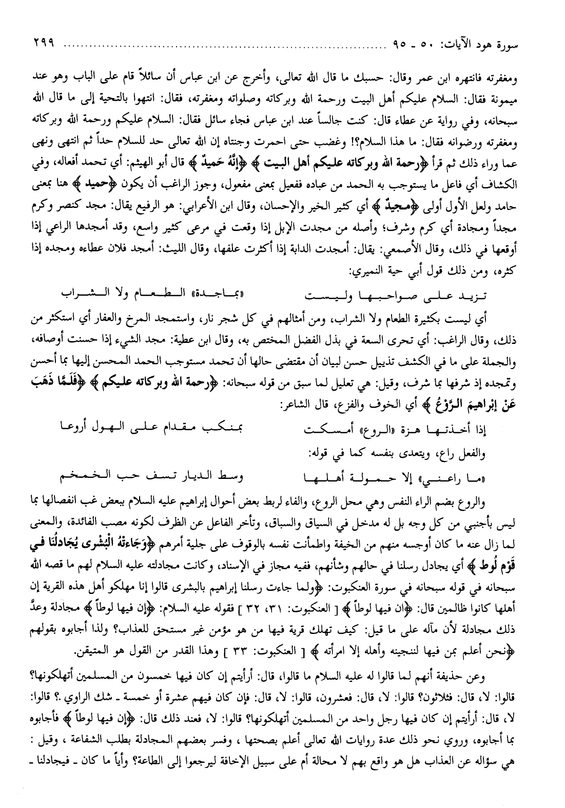 ومغفرته فانتهره ابن عمر وقال: حسبك ما قال الله تعالى، وأخرج عن ابن عباس أن سائلا قام على الباب وهو عند ميمونة فقال: السلام عليكم أهل البيت ورحمة الله وبركاته وصلواته ومغفرته، فقال: انتهوا بالتحية إلى ما قال الله سبحانه، وفي رواية عن عطاء قال: كنت جالسا عند ابن عباس فجاء سائل فقال: السلام عليكم ورحمة الله وبركاته ومغفرته ورضوانه فقال: ما هذا السلام؟! وغضب حتى احمرت وجنتاه إن الله تعالى حد للسلام حدا ثم انتهى ونهى عما وراء ذلك ثم قرأ رَحْمَتُ اللَّهِ وَبَرَكاتُهُ عَلَيْكُمْ أَهْلَ الْبَيْتِ إِنَّهُ حَمِيدٌ قال أبو الهيثم: أي تحمد أفعاله، وفي الكشاف أي فاعل ما يستوجب به الحمد من عباده ففعيل بمعنى مفعول، وجوز الراغب أن يكون حَمِيدٌ هنا بمعنى حامد ولعل الأول أولى مَجِيدٌ أي كثير الخير والإحسان، وقال ابن الأعرابي: هو الرفيع يقال: مجد كنصر وكرم مجدا ومجادة أي كرم وشرف وأصله من مجدت الإبل إذا وقعت في مرعى كثير واسع، وقد أمجدها الراعي إذا أوقعها في ذلك، وقال الأصمعي: يقال: أمجدت الدابة إذا أكثرت علفها، وقال الليث: أمجد فلان عطاءه ومجده إذا كثره، ومن ذلك قول أبي حية النميري: