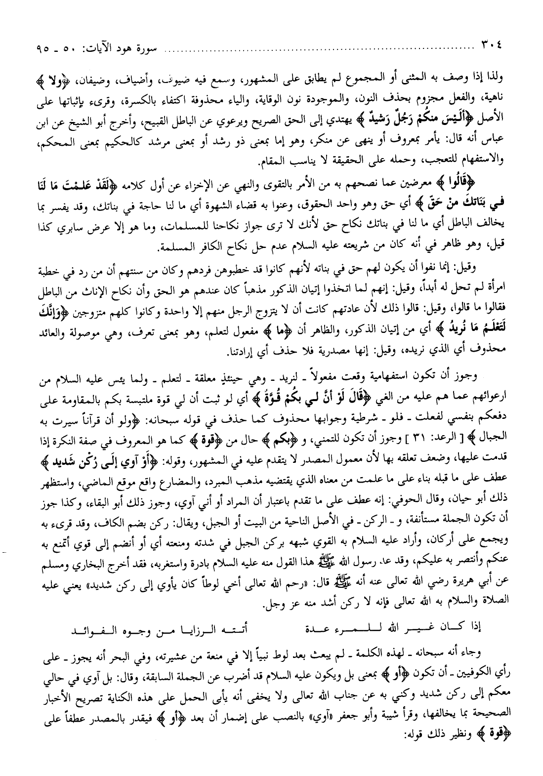 وجوز أن تكون استفهامية وقعت مفعولا- لنريد- وهي حينئذ معلقة- لتعلم- ولما يئس عليه السلام من ارعوائهم عما هم عليه من الغي قالَ لَوْ أَنَّ لِي بِكُمْ قُوَّةً أي لو ثبت أن لي قوة ملتبسة بكم بالمقاومة على دفعكم بنفسي لفعلت- فلو- شرطية وجوابها محذوف كما حذف في قوله سبحانه: وَلَوْ أَنَّ قُرْآناً سُيِّرَتْ بِهِ الْجِبالُ [الرعد: 31] وجوز أن تكون للتمني، وبِكُمْ حال من قُوَّةً كما هو المعروف في صفة النكرة إذا قدمت عليها، وضعف تعلقه بها لأن معمول المصدر لا يتقدم عليه في المشهور، وقوله: أَوْ آوِي إِلى رُكْنٍ شَدِيدٍ عطف على ما قبله بناء على ما علمت من معناه الذي يقتضيه مذهب المبرد، والمضارع واقع موقع الماضي، واستظهر ذلك أبو حيان، وقال الحوفي: إنه عطف على ما تقدم باعتبار أن المراد أو أني آوي، وجوز ذلك أبو البقاء، وكذا جوز أن تكون الجملة مستأنفة، والركن- في الأصل الناحية من البيت أو الجبل، ويقال: ركن بضم الكاف، وقد قرىء به ويجمع على أركان، وأراد عليه السلام به القوي شبهه بركن الجبل في شدته ومنعته أي أو أنضم إلى قوي أتمنع به عنكم وأنتصر به عليكم، وقد عد رسول الله صلّى الله عليه وسلم هذا القول منه عليه السلام بادرة واستغربه،