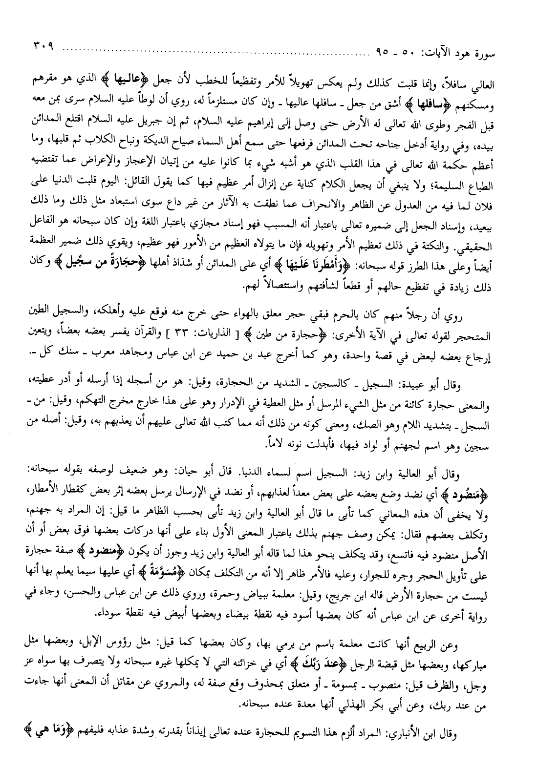 والسجيل الطين المتحجر لقوله تعالى في الآية الأخرى: حِجارَةً مِنْ طِينٍ [الذاريات: 33] والقرآن يفسر بعضه بعضا، ويتعين إرجاع بعضه لبعض في قصة واحدة، وهو كما أخرج عبد بن حميد عن ابن عباس ومجاهد معرب- سنك كل-.