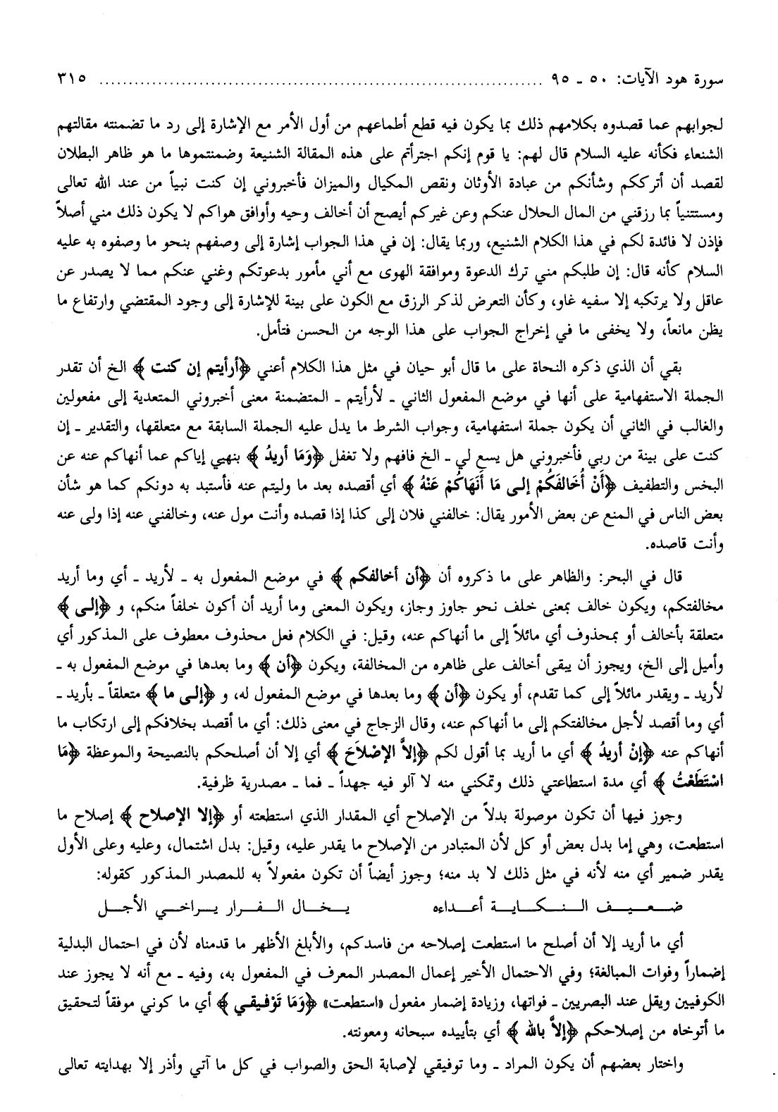 قال في البحر: والظاهر على ما ذكروه أن أَنْ أُخالِفَكُمْ في موضع المفعول به- لأريد- أي وما أريد مخالفتكم، ويكون خالف بمعنى خلف نحو جاوز وجاز، ويكون المعنى وما أريد أن أكون خلفا منكم، وإِلى متعلقة بأخالف أو بمحذوف أي مائلا إلى ما أنهاكم عنه، وقيل: في الكلام فعل محذوف معطوف على المذكور أي وأميل إلى إلخ، ويجوز أن يبقى أخالف على ظاهره من المخالفة، ويكون إِنْ وما بعدها في موضع المفعول به- لأريد- ويقدر مائلا إلى كما تقدم، أو يكون إِنْ وما بعدها في موضع المفعول له، وإِلى ما متعلقا- بأريد- أي وما أقصد لأجل مخالفتكم إلى ما أنهاكم عنه، وقال الزجاج في معنى ذلك: أي ما أقصد بخلافكم إلى ارتكاب ما أنهاكم عنه إِنْ أُرِيدُ أي ما أريد بما أقول لكم إِلَّا الْإِصْلاحَ أي إلا أن أصلحكم بالنصيحة والموعظة مَا اسْتَطَعْتُ أي مدة استطاعتي ذلك وتمكني منه لا آلو فيه جهدا- فما- مصدرية ظرفية.