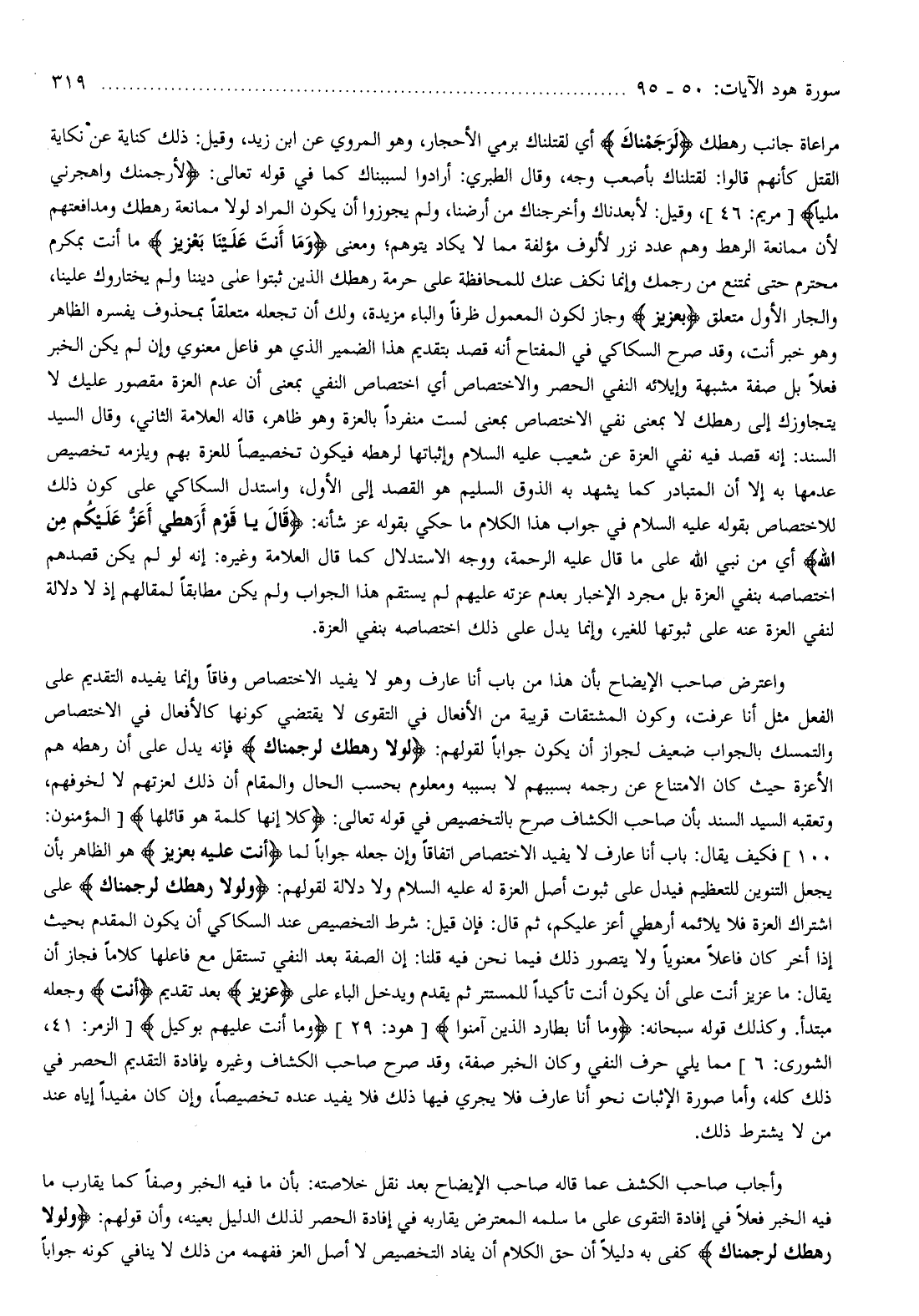 واعترض صاحب الإيضاح بأن هذا من باب أنا عارف وهو لا يفيد الاختصاص وفاقا وإنما يفيده التقديم على الفعل مثل أنا عرفت، وكون المشتقات قريبة من الأفعال في التقوى لا يقتضي كونها كالأفعال في الاختصاص والتمسك بالجواب ضعيف لجواز أن يكون جوابا لقولهم: لَوْلا رَهْطُكَ لَرَجَمْناكَ فإنه يدل على أن رهطه هم الأعزة حيث كان الامتناع عن رجمه بسببهم لا بسببه ومعلوم بحسب الحال والمقام أن ذلك لعزتهم لا لخوفهم، وتعقبه السيد السند بأن صاحب الكشاف صرح بالتخصيص في قوله تعالى: كَلَّا إِنَّها كَلِمَةٌ هُوَ قائِلُها [المؤمنون:
