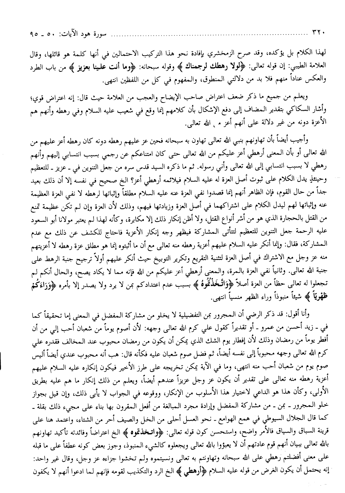 ويعلم من جميع ما ذكر ضعف اعتراض صاحب الإيضاح والعجب من العلامة حيث قال: إنه اعتراض قوي وأشار السكاكي بتقدير المضاف إلى دفع الإشكال بأن كلامهم إنما وقع في شعيب عليه السلام وفي رهطه وأنهم هم الأعزة دونه من غير دلالة على أنهم أعز من الله تعالى.