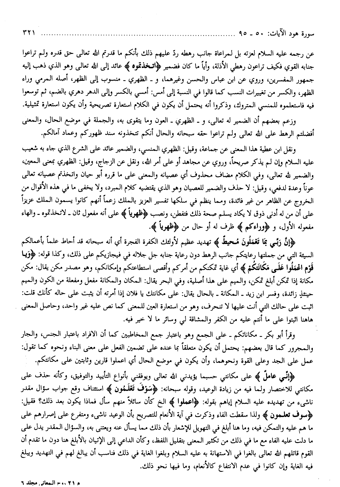 ونقل ابن عطية هذا المعنى عن جماعة، وقيل: الظهري المنسي، والضمير عائد على الشرع الذي جاء به شعيب عليه السلام وإن لم يذكر صريحا، وروي عن مجاهد أو على أمر الله، ونقل عن الزجاج، وقيل: الظهري بمعنى المعين، والضمير لله تعالى، وفي الكلام مضاف محذوف أي عصيانه والمعنى على ما قرره أبو حيان واتخذتم عصيانه تعالى عونا وعدة لدفعي، وقيل: لا حذف والضمير للعصيان وهو الذي يقتضيه كلام المبرد، ولا يخفى ما في هذه الأقوال من الخروج عن الظاهر من غير فائدة، ومما ينظم في سلكها تفسير العزيز بالملك زعما أنهم كانوا يسمون الملك عزيزا على أن من له أدنى ذوق لا يكاد يسلم صحة ذلك فتفطن، ونصب ظِهْرِيًّا على أنه مفعول ثان- لاتخذتموه- والهاء مفعوله الأول، ووَراءَكُمْ ظرف له أو حال من ظِهْرِيًّا.