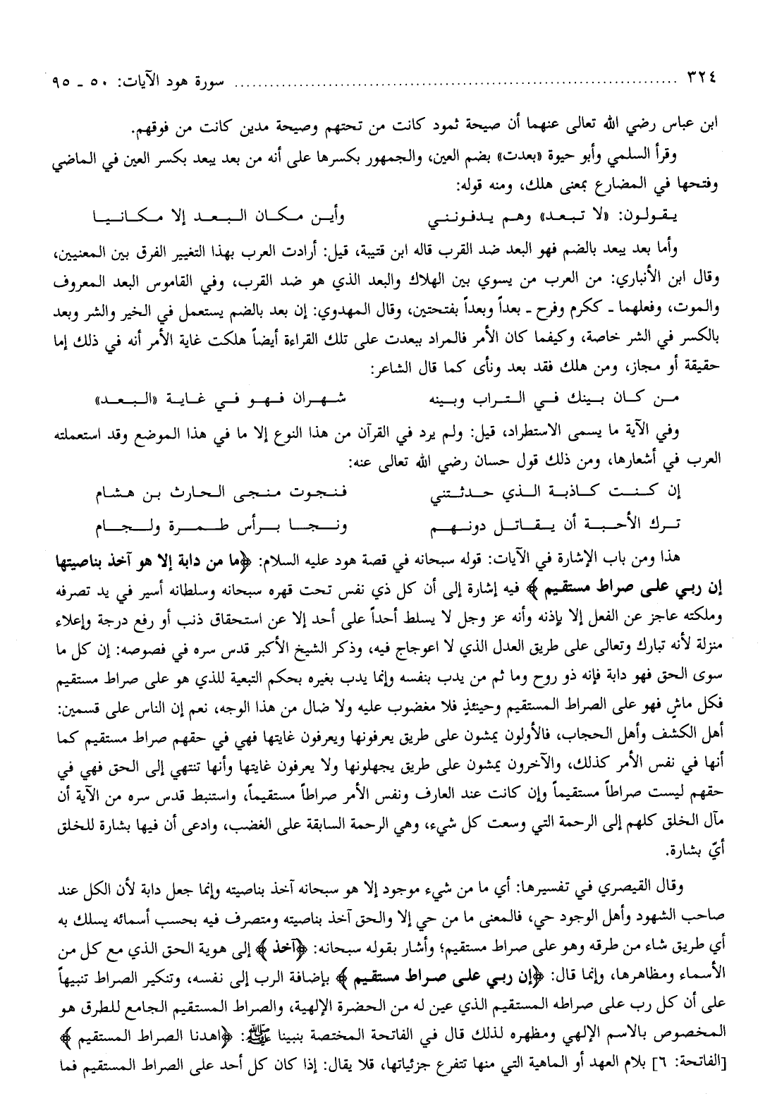وقال القيصري في تفسيرها: أي ما من شيء موجود إلا هو سبحانه آخذ بناصيته وإنما جعل دابة لأن الكل عند صاحب الشهود وأهل الوجود حي، فالمعنى ما من حي إلا والحق آخذ بناصيته ومتصرف فيه بحسب أسمائه يسلك به أي طريق شاء من طرقه وهو على صراط مستقيم وأشار بقوله سبحانه: آخِذٌ إلى هوية الحق الذي مع كل من الأسماء ومظاهرها، وإنما قال: إِنَّ رَبِّي عَلى صِراطٍ مُسْتَقِيمٍ بإضافة الرب إلى نفسه، وتنكير الصراط تنبيها على أن كل رب على صراطه المستقيم الذي عين له من الحضرة الإلهية، والصراط المستقيم الجامع للطرق هو المخصوص بالاسم الإلهي ومظهره لذلك قال في الفاتحة المختصة بنبينا صلّى الله عليه وسلم: اهْدِنَا الصِّراطَ الْمُسْتَقِيمَ [الفاتحة: 6] بلام العهد أو الماهية التي منها تتفرع جزئياتها، فلا يقال: إذا كان كل أحد على الصراط المستقيم فما