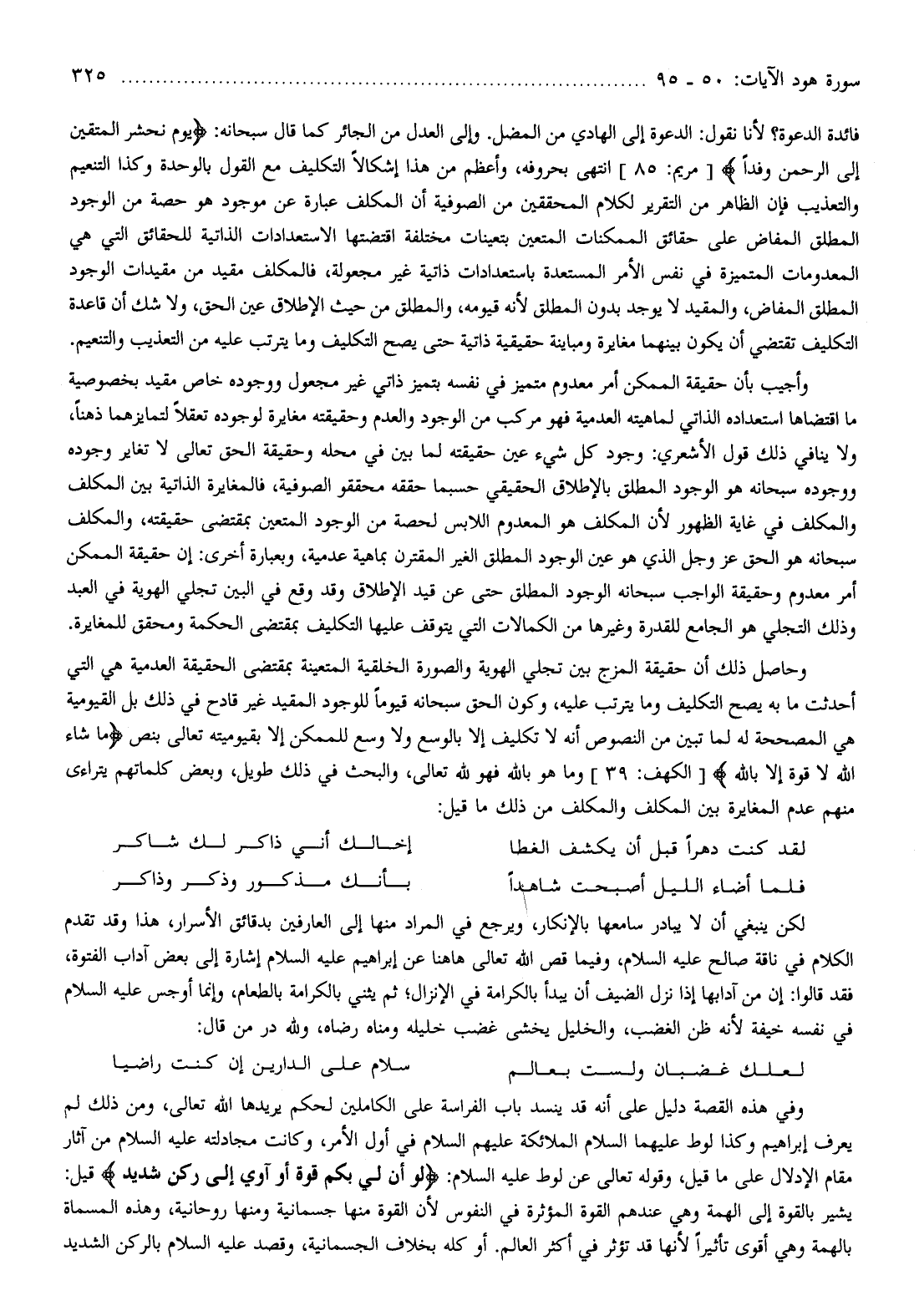 فائدة الدعوة؟ لأنا نقول: الدعوة إلى الهادي من المضل. وإلى العدل من الجائر كما قال سبحانه: يَوْمَ نَحْشُرُ الْمُتَّقِينَ إِلَى الرَّحْمنِ وَفْداً [مريم: 85] انتهى بحروفه، وأعظم من هذا إشكالا التكليف مع القول بالوحدة وكذا التنعيم والتعذيب فإن الظاهر من التقرير لكلام المحققين من الصوفية أن المكلف عبارة عن موجود هو حصة من الوجود المطلق المفاض على حقائق الممكنات المتعين بتعينات مختلفة اقتضتها الاستعدادات الذاتية للحقائق التي هي المعدومات المتميزة في نفس الأمر المستعدة باستعدادات ذاتية غير مجعولة، فالمكلف مقيد من مقيدات الوجود المطلق المفاض، والمقيد لا يوجد بدون المطلق لأنه قيومه، والمطلق من حيث الإطلاق عين الحق، ولا شك أن قاعدة التكليف تقتضي أن يكون بينهما مغايرة ومباينة حقيقية ذاتية حتى يصح التكليف وما يترتب عليه من التعذيب والتنعيم.