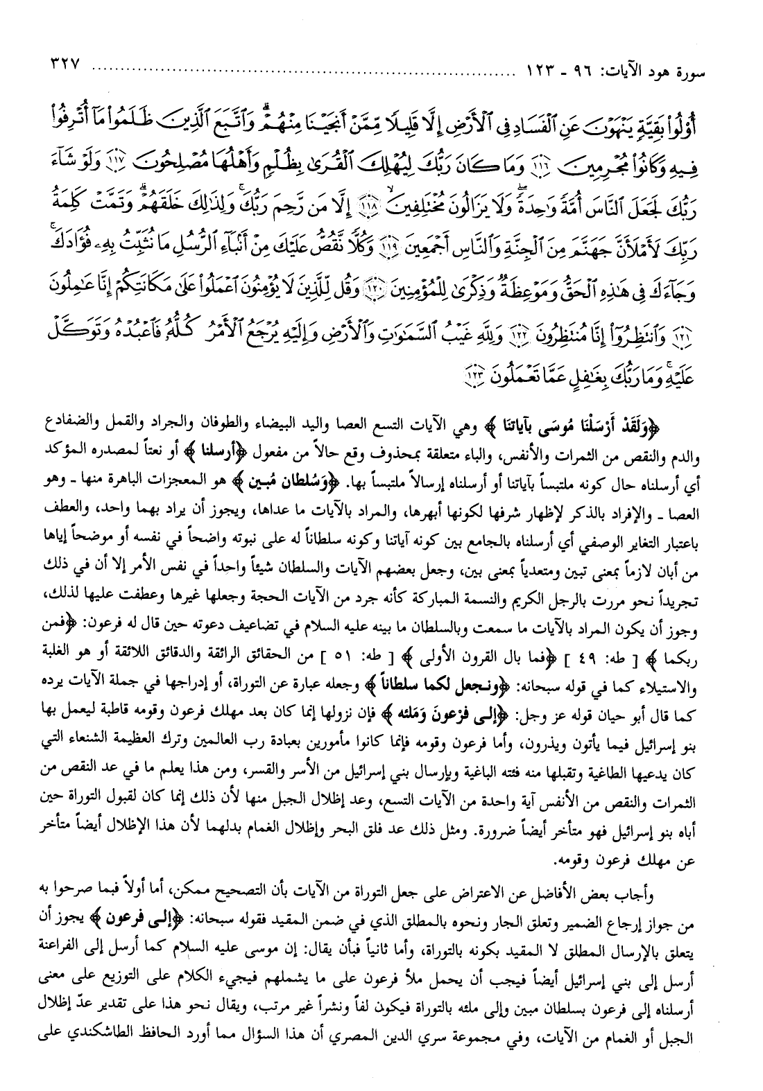 وَلَقَدْ أَرْسَلْنا مُوسى بِآياتِنا وهي الآيات التسع العصا واليد البيضاء والطوفان والجراد والقمل والضفادع والدم والنقص من الثمرات والأنفس، والباء متعلقة بمحذوف وقع حالا من مفعول أَرْسَلْنا أو نعتا لمصدره المؤكد أي أرسلناه حال كونه ملتبسا بآياتنا أو أرسلناه إرسالا ملتبسا بها. وَسُلْطانٍ مُبِينٍ هو المعجزات الباهرة منها- وهو العصا- والإفراد بالذكر لإظهار شرفها لكونها أبهرها، والمراد بالآيات ما عداها، ويجوز أن يراد بهما واحد، والعطف باعتبار التغاير الوصفي أي أرسلناه بالجامع بين كونه آياتنا وكونه سلطانا له على نبوته واضحا في نفسه أو موضحا إياها من أبان لازما بمعنى تبين ومتعديا بمعنى بين، وجعل بعضهم الآيات والسلطان شيئا واحدا في نفس الأمر إلا أن في ذلك تجريدا نحو مررت بالرجل الكريم والنسمة المباركة كأنه جرد من الآيات الحجة وجعلها غيرها وعطفت عليها لذلك، وجوز أن يكون المراد بالآيات ما سمعت وبالسلطان ما بينه عليه السلام في تضاعيف دعوته حين قال له فرعون: فَمَنْ رَبُّكُما [طه: 49] فَما بالُ الْقُرُونِ الْأُولى [طه: 51] من الحقائق الرائقة والدقائق اللائقة أو هو الغلبة والاستيلاء كما في قوله سبحانه: وَنَجْعَلُ لَكُما سُلْطاناً وجعله عبارة عن التوراة، أو إدراجها في جملة الآيات يرده كما قال أبو حيان قوله عز وجل: إِلى فِرْعَوْنَ وَمَلَائِهِ فإن نزولها إنما كان بعد مهلك فرعون وقومه قاطبة ليعمل بها بنو إسرائيل فيما يأتون ويذرون، وأما فرعون وقومه فإنما كانوا مأمورين بعبادة رب العالمين وترك العظيمة الشنعاء التي كان يدعيها الطاغية وتقبلها منه فئته الباغية وبإرسال بني إسرائيل من الأسر والقسر، ومن هذا يعلم ما في عد النقص من الثمرات والنقص من الأنفس آية واحدة من الآيات التسع، وعد إظلال الجبل منها لأن ذلك إنما كان لقبول التوراة حين أباه بنو إسرائيل فهو متأخر أيضا ضرورة. ومثل ذلك عد فلق البحر وإظلال الغمام بدلهما لأن هذا الإظلال أيضا متأخر عن مهلك فرعون وقومه.