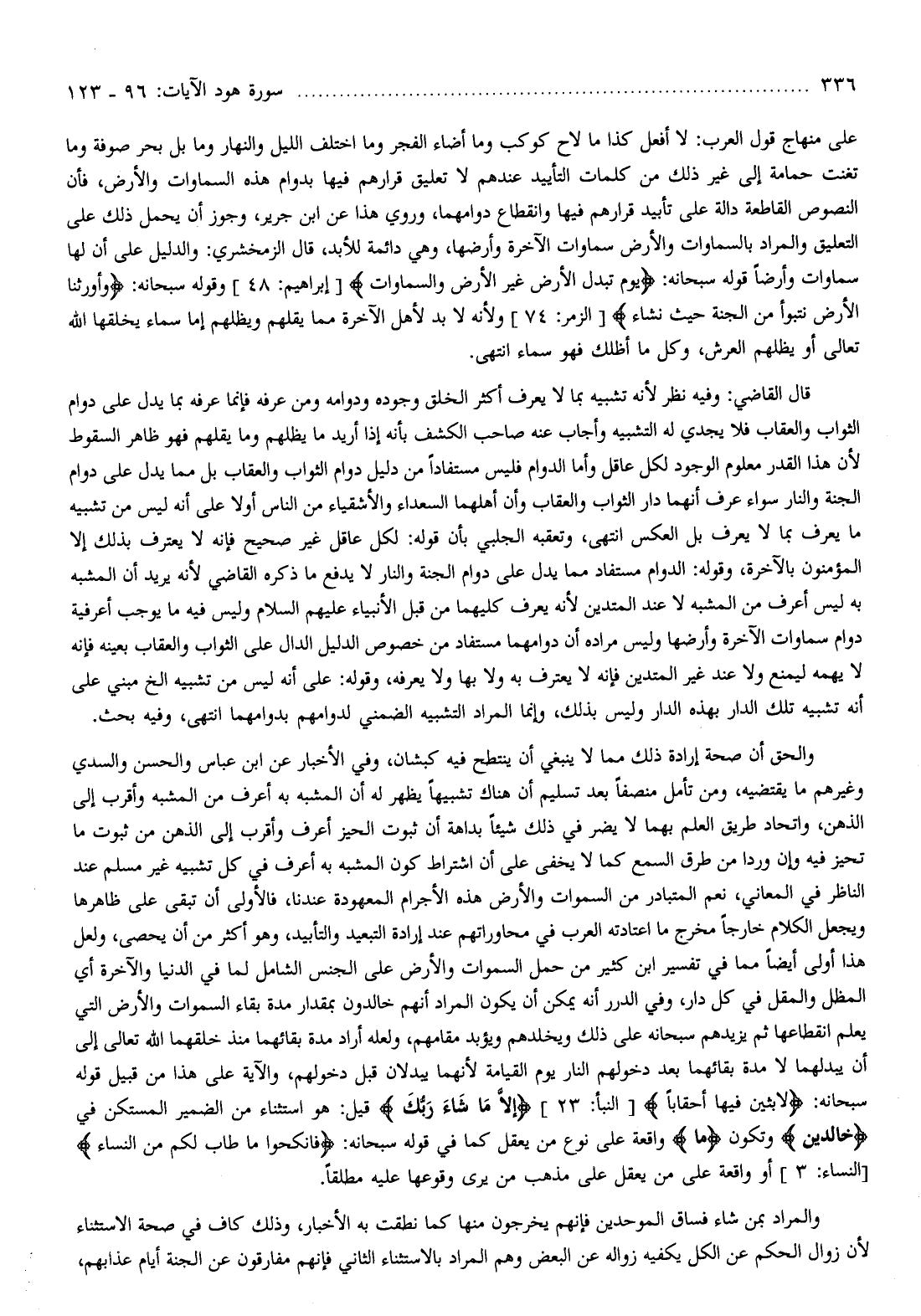 على منهاج قول العرب: لا أفعل كذا ما لاح كوكب وما أضاء الفجر وما اختلف الليل والنهار وما بل بحر صوفة وما تغنت حمامة إلى غير ذلك من كلمات التأييد عندهم لا تعليق قرارهم فيها بدوام هذه السماوات والأرض، فأن النصوص القاطعة دالة على تأبيد قرارهم فيها وانقطاع دوامهما، وروي هذا عن ابن جرير، وجوز أن يحمل ذلك على التعليق والمراد بالسماوات والأرض سماوات الآخرة وأرضها، وهي دائمة للأبد، قال الزمخشري: والدليل على أن لها سماوات وأرضا قوله سبحانه: يَوْمَ تُبَدَّلُ الْأَرْضُ غَيْرَ الْأَرْضِ وَالسَّماواتُ [إبراهيم: 48] وقوله سبحانه: وَأَوْرَثَنَا الْأَرْضَ نَتَبَوَّأُ مِنَ الْجَنَّةِ حَيْثُ نَشاءُ [الزمر: 74] ولأنه لا بد لأهل الآخرة مما يقلهم ويظلهم إما سماء يخلقها الله تعالى أو يظلهم العرش، وكل ما أظلك فهو سماء انتهى.