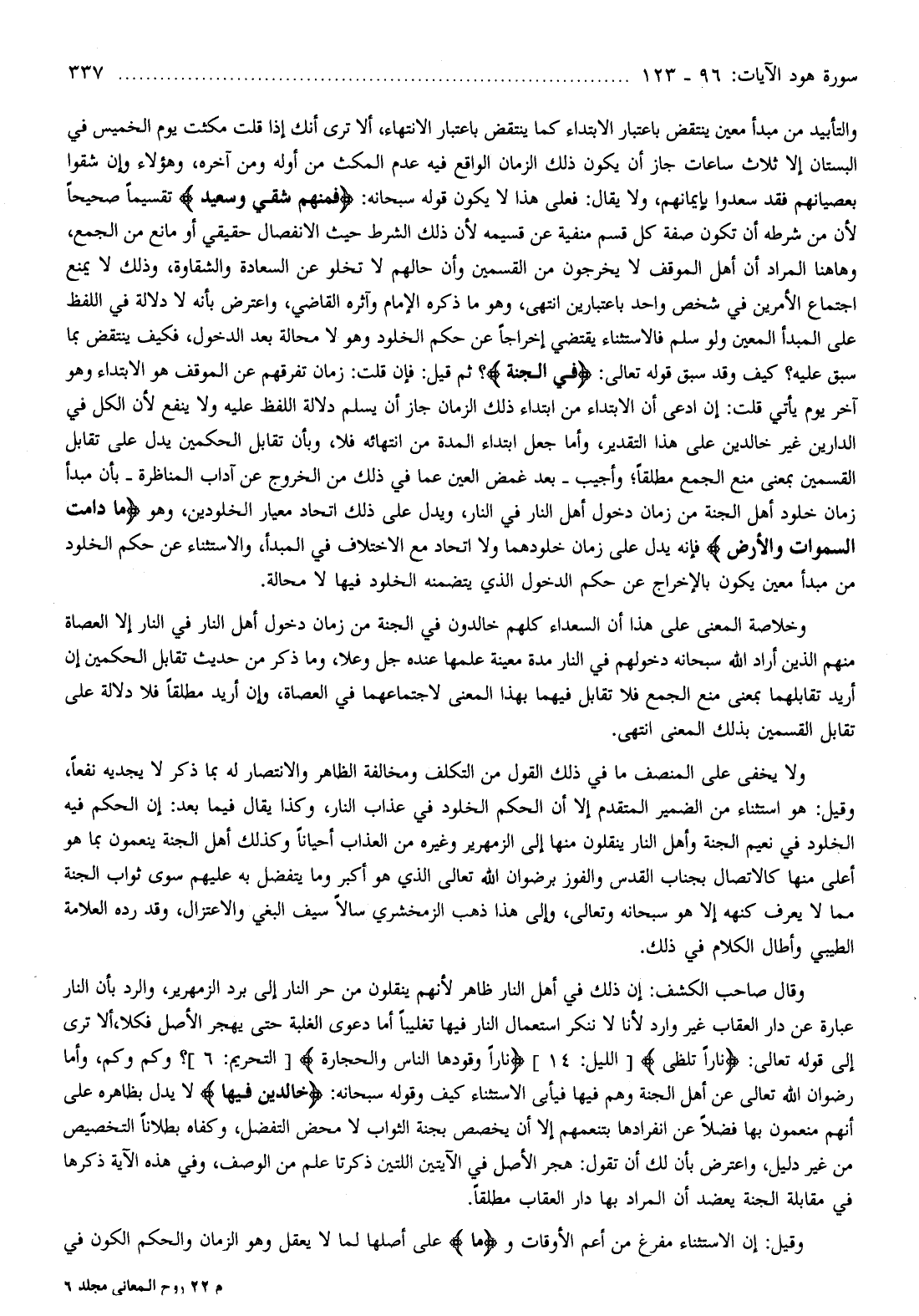 ولا يخفى على المنصف ما في ذلك القول من التكلف ومخالفة الظاهر والانتصار له بما ذكر لا يجديه نفعا، وقيل: هو استثناء من الضمير المتقدم إلا أن الحكم الخلود في عذاب النار، وكذا يقال فيما بعد: إن الحكم فيه الخلود في نعيم الجنة وأهل النار ينقلون منها إلى الزمهرير وغيره من العذاب أحيانا وكذلك أهل الجنة ينعمون بما هو أعلى منها كالاتصال بجناب القدس والفوز برضوان الله تعالى الذي هو أكبر وما يتفضل به عليهم سوى ثواب الجنة مما لا يعرف كنهه إلا هو سبحانه وتعالى، وإلى هذا ذهب الزمخشري سالا سيف البغي والاعتزال، وقد رده العلامة الطيبي وأطال الكلام في ذلك.