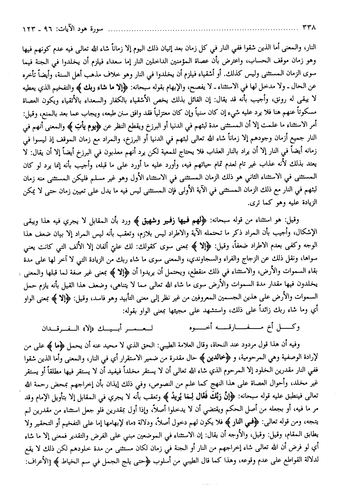 وفيه أن هذا قول مردود عند النحاة، وقال العلامة الطيبي: الحق الذي لا محيد عنه أن يحمل ما على من لإرادة الوصفية وهي المرحومية، وخالِدِينَ حال مقدرة من ضمير الاستقرار أي في النار، والمعنى وأما الذين شقوا ففي النار مقدرين الخلود إلا المرحوم الذي شاء الله تعالى أن لا يستقر مخلدا فيفيد أن لا يستقر فيها مطلقا أو يستقر غير مخلد، وأحوال العصاة على هذا النهج كما علم من النصوص، وفي ذلك إيذان بأن إخراجهم بمحض رحمة الله تعالى فينطبق عليه قوله سبحانه: إِنَّ رَبَّكَ فَعَّالٌ لِما يُرِيدُ وتعقب بأنه لا يجري في المقابل إلا بتأويل الإمام وقد مر ما فيه، أو بجعله من أصل الحكم ويقتضي أن لا يدخلوا أصلا، وإذا أول بمقدرين فلو جعل استثناء من مقدرين لم يتجه، ومن قوله تعالى: فَفِي النَّارِ فلا يكون لهم دخول أصلا، ودلالة «ما» لإبهامها إما على التفخيم أو التحقير ولا يطابق المقام، وقيل: وقيل، والأوجه أن يقال: إن الاستثناء في الموضعين مبني على الفرض والتقدير فمعنى إلا ما شاء أي لو فرض أن الله تعالى شاء إخراجهم من النار أو الجنة في زمان لكان مستثنى من مدة خلودهم لكن ذلك لا يقع لدلالة القواطع على عدم وقوعه، وهذا كما قال الطيبي من أسلوب حَتَّى يَلِجَ الْجَمَلُ فِي سَمِّ الْخِياطِ [الأعراف: