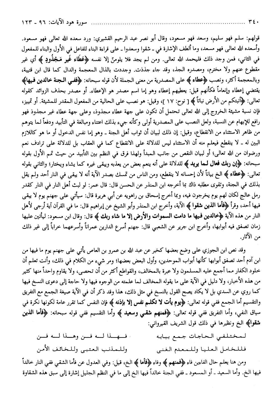 وقد نص ابن الجوزي على وضع بعضها كخبر عن عبد الله بن عمرو بن العاص يأتي على جهنم يوم ما فيها من ابن آدم أحد تصفق أبوابها كأنها أبواب الموحدين، وأول البعض بعضها ومر شيء من الكلام في ذلك، وأنت تعلم أن خلود الكفار مما أجمع عليه المسلمون ولا عبرة بالمخالف، والقواطع أكثر من أن تحصى، ولا يقاوم واحدا منها كثير من هذه الأخبار، ولا دليل في الآية على ما يقوله المخالف لما علمته من الوجوه فيها ولا حاجة إلى دعوى النسخ فيها كما روي عن السدي بل لا يكاد يصح القول بالنسخ في مثل ذلك، هذا وقد ذكر أن في الآية صيغة الجمع مع التفريق والتقسيم أما الجمع ففي قوله تعالى: يَوْمَ يَأْتِ لا تَكَلَّمُ نَفْسٌ إِلَّا بِإِذْنِهِ فإن النفس كما تقرر عامة لكونها نكرة في سياق النفي، وأما التفريق ففي قوله تعالى: فَمِنْهُمْ شَقِيٌّ وَسَعِيدٌ وأما التقسيم ففي قوله سبحانه: فَأَمَّا الَّذِينَ شَقُوا إلخ ونظيرها في ذلك قول الشريف القيرواني: