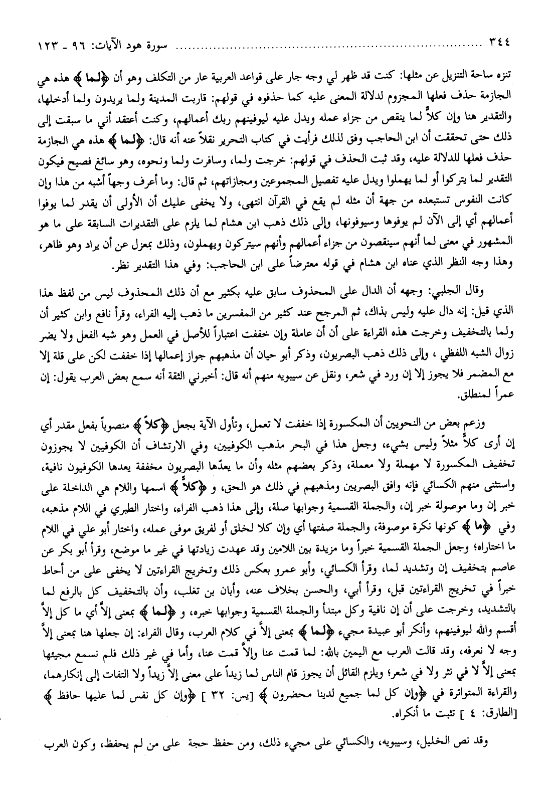 تنزه ساحة التنزيل عن مثلها: كنت قد ظهر لي وجه جار على قواعد العربية عار من التكلف وهو أن لَمَّا هذه هي الجازمة حذف فعلها المجزوم لدلالة المعنى عليه كما حذفوه في قولهم: قاربت المدينة ولما يريدون ولما أدخلها، والتقدير هنا وإن كلّا لما ينقص من جزاء عمله ويدل عليه ليوفينهم ربك أعمالهم، وكنت أعتقد أني ما سبقت إلى ذلك حتى تحققت أن ابن الحاجب وفق لذلك فرأيت في كتاب التحرير نقلا عنه أنه قال: لَمَّا هذه هي الجازمة حذف فعلها للدلالة عليه، وقد ثبت الحذف في قولهم: خرجت ولما، وسافرت ولما ونحوه، وهو سائغ فصيح فيكون التقدير لما يتركوا أو لما يهملوا ويدل عليه تفصيل المجموعين ومجازاتهم، ثم قال: وما أعرف وجها أشبه من هذا وإن كانت النفوس تستبعده من جهة أن مثله لم يقع في القرآن انتهى، ولا يخفى عليك أن الأولى أن يقدر لما يوفوا أعمالهم أي إلى الآن لم يوفوها وسيوفونها، وإلى ذلك ذهب ابن هشام لما يلزم على التقديرات السابقة على ما هو المشهور في معنى لما أنهم سينقصون من جزاء أعمالهم وأنهم سيتركون ويهملون، وذلك بمعزل عن أن يراد وهو ظاهر، وهذا وجه النظر الذي عناه ابن هشام في قوله معترضا على ابن الحاجب: وفي هذا التقدير نظر.