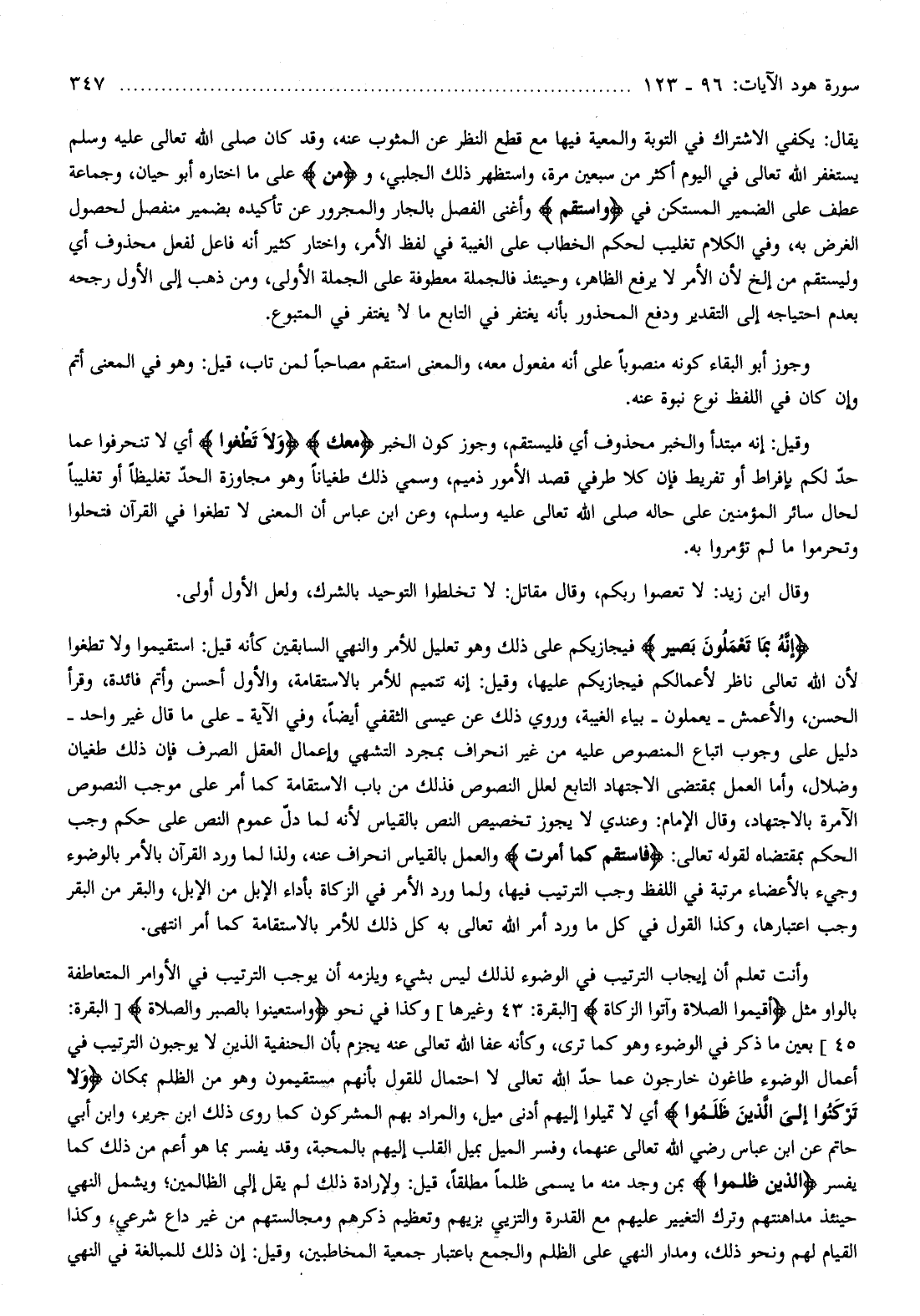 45] بعين ما ذكر في الوضوء وهو كما ترى، وكأنه عفا الله تعالى عنه يجزم بأن الحنفية الذين لا يوجبون الترتيب في أعمال الوضوء طاغون خارجون عما حدّ الله تعالى لا احتمال للقول بأنهم مستقيمون وهو من الظلم بمكان وَلا تَرْكَنُوا إِلَى الَّذِينَ ظَلَمُوا أي لا تميلوا إليهم أدنى ميل، والمراد بهم المشركون كما روى ذلك ابن جرير، وابن أبي حاتم عن ابن عباس رضي الله تعالى عنهما، وفسر الميل بميل القلب إليهم بالمحبة، وقد يفسر بما هو أعم من ذلك كما يفسر الَّذِينَ ظَلَمُوا بمن وجد منه ما يسمى ظلما مطلقا، قيل: ولإرادة ذلك لم يقل إلى الظالمين ويشمل النهي حينئذ مداهنتهم وترك التغيير عليهم مع القدرة والتزيي بزيهم وتعظيم ذكرهم ومجالستهم من غير داع شرعي، وكذا القيام لهم ونحو ذلك، ومدار النهي على الظلم والجمع باعتبار جمعية المخاطبين، وقيل: إن ذلك للمبالغة في النهي