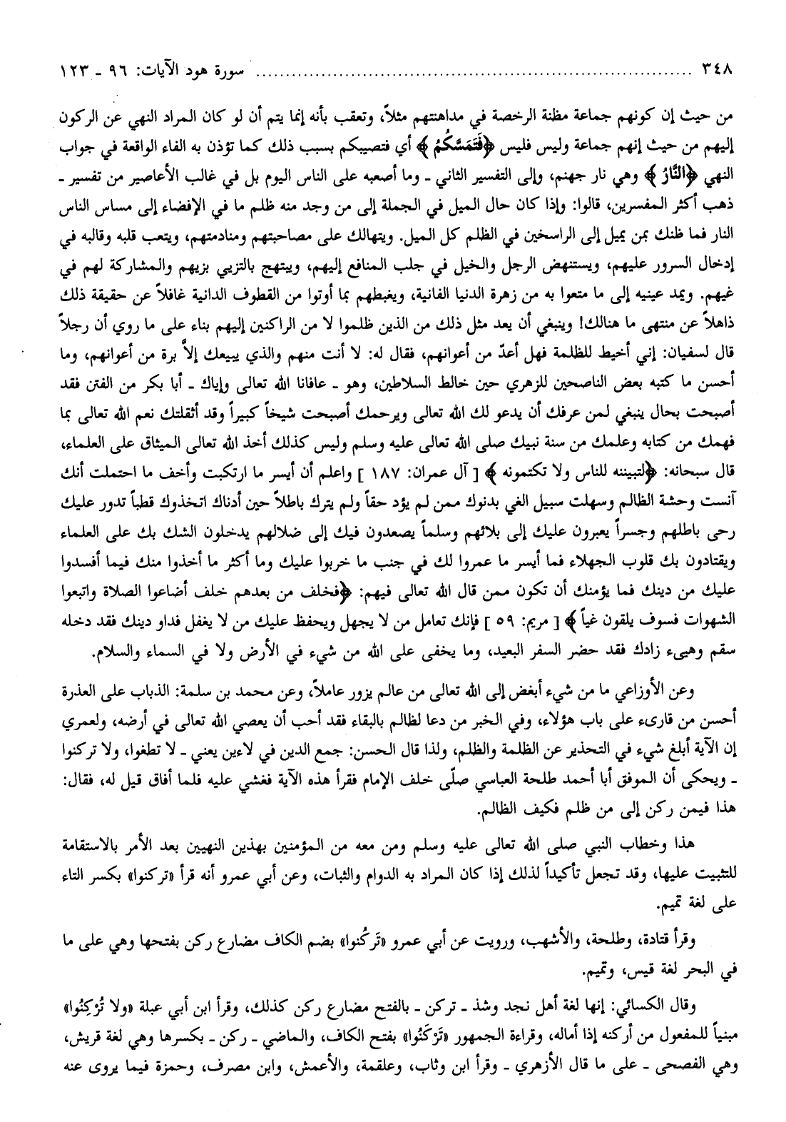 وقال الكسائي: إنها لغة أهل نجد وشذ- تركن- بالفتح مضارع ركن كذلك، وقرأ ابن أبي عبلة «ولا تركنوا» مبنيا للمفعول من أركنه إذا أماله، وقراءة الجمهور «تركنوا» بفتح الكاف، والماضي- ركن- بكسرها وهي لغة قريش، وهي الفصحى- على ما قال الأزهري- وقرأ ابن وثاب، وعلقمة، والأعمش، وابن مصرف، وحمزة فيما يروى عنه