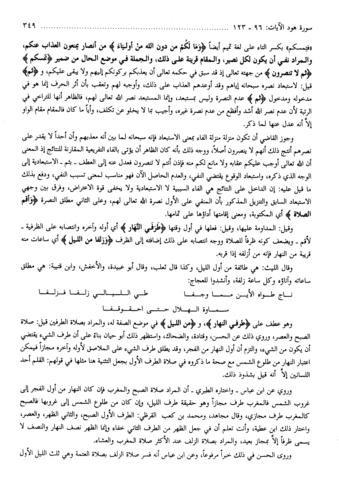 سماوة الهلال حتى احقوقفا وهو عطف على طَرَفَيِ النَّهارِ، ومِنَ اللَّيْلِ في موضع الصفة له، والمراد بصلاة الطرفين قيل: صلاة الصبح والعصر، وروي ذلك عن الحسن، وقتادة، والضحاك، واستظهر ذلك أبو حيان بناء على أن طرف الشيء يقتضي أن يكون من الشيء، والتزم أن أول النهار من الفجر، وقد يطلق طرف الشيء على الملاصق لأوله وآخره مجازا فيمكن اعتبار النهار من طلوع الشمس مع صحة ما ذكروه في صلاة الطرف الأول بجعل التثنية هنا مثلها في قولهم: القلم أحد اللسانين إلّا أنه قيل بشذوذ ذلك.