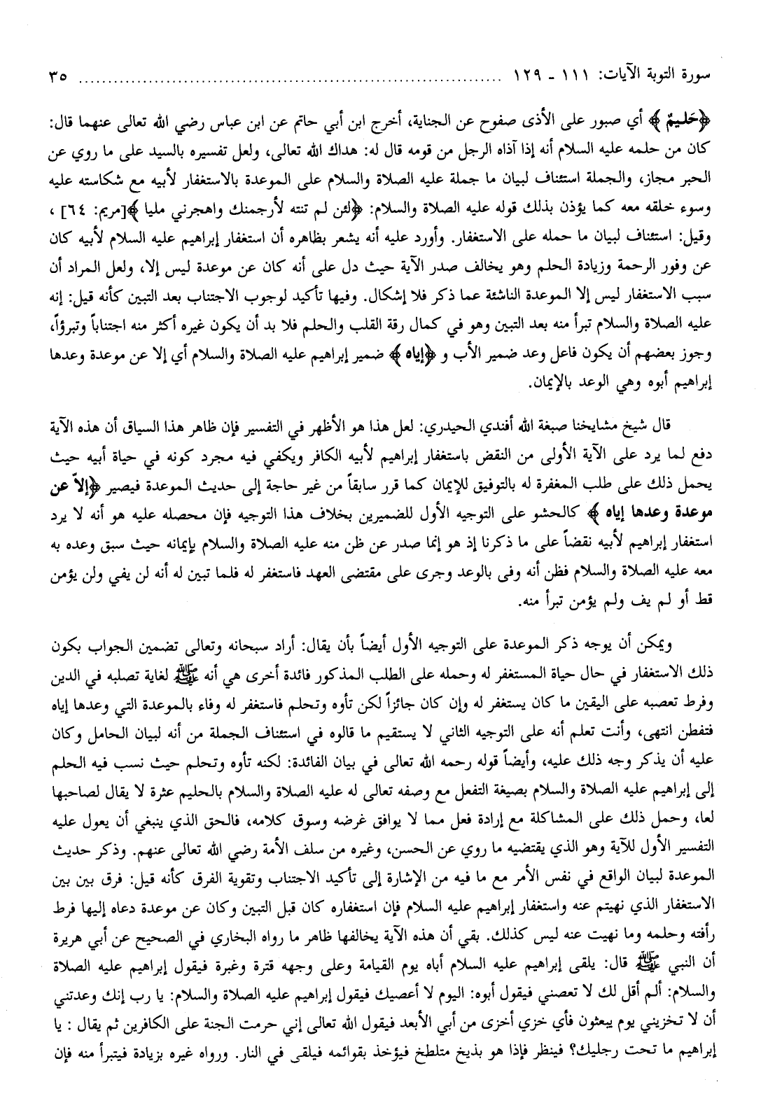 قال شيخ مشايخنا صبغة الله أفندي الحيدري: لعل هذا هو الأظهر في التفسير فإن ظاهر هذا السياق أن هذه الآية دفع لما يرد على الآية الأولى من النقض باستغفار إبراهيم لأبيه الكافر ويكفي فيه مجرد كونه في حياة أبيه حيث يحمل ذلك على طلب المغفرة له بالتوفيق للإيمان كما قرر سابقا من غير حاجة إلى حديث الموعدة فيصير إِلَّا عَنْ مَوْعِدَةٍ وَعَدَها إِيَّاهُ كالحشو على التوجيه الأول للضميرين بخلاف هذا التوجيه فإن محصله عليه هو أنه لا يرد استغفار إبراهيم لأبيه نقضا على ما ذكرنا إذ هو إنما صدر عن ظن منه عليه الصلاة والسلام بإيمانه حيث سبق وعده به معه عليه الصلاة والسلام فظن أنه وفى بالوعد وجرى على مقتضى العهد فاستغفر له فلما تبين له أنه لن يفي ولن يؤمن قط أو لم يف ولم يؤمن تبرأ منه.