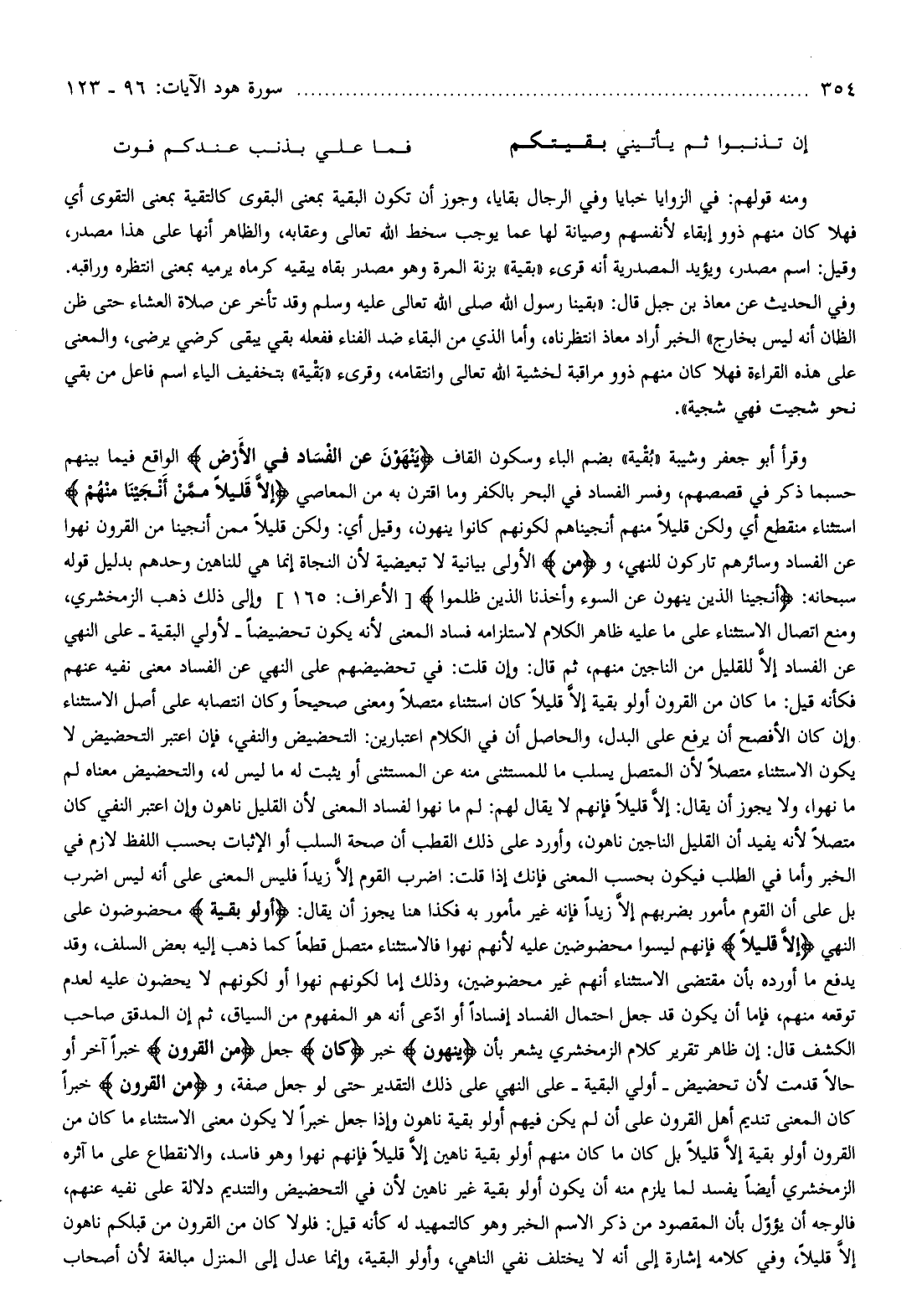 وقرأ أبو جعفر وشيبة «بقية» بضم الباء وسكون القاف يَنْهَوْنَ عَنِ الْفَسادِ فِي الْأَرْضِ الواقع فيما بينهم حسبما ذكر في قصصهم، وفسر الفساد في البحر بالكفر وما اقترن به من المعاصي إِلَّا قَلِيلًا مِمَّنْ أَنْجَيْنا مِنْهُمْ استثناء منقطع أي ولكن قليلا منهم أنجيناهم لكونهم كانوا ينهون، وقيل أي: ولكن قليلا ممن أنجينا من القرون نهوا عن الفساد وسائرهم تاركون للنهي، ومِنَ الأولى بيانية لا تبعيضية لأن النجاة إنما هي للناهين وحدهم بدليل قوله سبحانه: أَنْجَيْنَا الَّذِينَ يَنْهَوْنَ عَنِ السُّوءِ وَأَخَذْنَا الَّذِينَ ظَلَمُوا [الأعراف: 165] وإلى ذلك ذهب الزمخشري، ومنع اتصال الاستثناء على ما عليه ظاهر الكلام لاستلزامه فساد المعنى لأنه يكون تحضيضا- لأولي البقية- على النهي عن الفساد إلّا للقليل من الناجين منهم، ثم قال: وإن قلت: في تحضيضهم على النهي عن الفساد معنى نفيه عنهم فكأنه قيل: ما كان من القرون أولو بقية إلّا قليلا كان استثناء متصلا ومعنى صحيحا وكان انتصابه على أصل الاستثناء وإن كان الأفصح أن يرفع على البدل، والحاصل أن في الكلام اعتبارين: التحضيض والنفي، فإن اعتبر التحضيض لا يكون الاستثناء متصلا لأن المتصل يسلب ما للمستثنى منه عن المستثنى أو يثبت له ما ليس له، والتحضيض معناه لم ما نهوا، ولا يجوز أن يقال: إلّا قليلا فإنهم لا يقال لهم: لم ما نهوا لفساد المعنى لأن القليل ناهون وإن اعتبر النفي كان متصلا لأنه يفيد أن القليل الناجين ناهون، وأورد على ذلك القطب أن صحة السلب أو الإثبات بحسب اللفظ لازم في الخبر وأما في الطلب فيكون بحسب المعنى فإنك إذا قلت: اضرب القوم إلّا زيدا فليس المعنى على أنه ليس اضرب بل على أن القوم مأمور بضربهم إلّا زيدا فإنه غير مأمور به فكذا هنا يجوز أن يقال: أُولُوا بَقِيَّةٍ محضوضون على النهي إِلَّا قَلِيلًا فإنهم ليسوا محضوضين عليه لأنهم نهوا فالاستثناء متصل قطعا كما ذهب إليه بعض السلف، وقد يدفع ما أورده بأن مقتضى الاستثناء أنهم غير محضوضين، وذلك إما لكونهم نهوا أو لكونهم لا يحضون عليه لعدم توقعه منهم، فإما أن يكون قد جعل احتمال الفساد إفسادا أو ادّعى أنه هو المفهوم من السياق، ثم إن المدقق صاحب الكشف قال: إن ظاهر تقرير كلام الزمخشري يشعر بأن يَنْهَوْنَ خبر كانَ جعل مِنَ الْقُرُونِ خبرا آخر أو حالا قدمت لأن تحضيض- أولي البقية- على النهي على ذلك التقدير حتى لو جعل صفة، ومِنَ الْقُرُونِ خبرا كان المعنى تنديم أهل القرون على أن لم يكن فيهم أولو بقية ناهون وإذا جعل خبرا لا يكون معنى الاستثناء ما كان من القرون أولو بقية إلّا قليلا بل كان ما كان منهم أولو بقية ناهين إلّا قليلا فإنهم نهوا وهو فاسد، والانقطاع على ما آثره الزمخشري أيضا يفسد لما يلزم منه أن يكون أولو بقية غير ناهين لأن في التحضيض والتنديم دلالة على نفيه عنهم، فالوجه أن يؤوّل بأن المقصود من ذكر الاسم الخبر وهو كالتمهيد له كأنه قيل: فلولا كان من القرون من قبلكم ناهون إلّا قليلا، وفي كلامه إشارة إلى أنه لا يختلف نفي الناهي، وأولو البقية، وإنما عدل إلى المنزل مبالغة لأن أصحاب