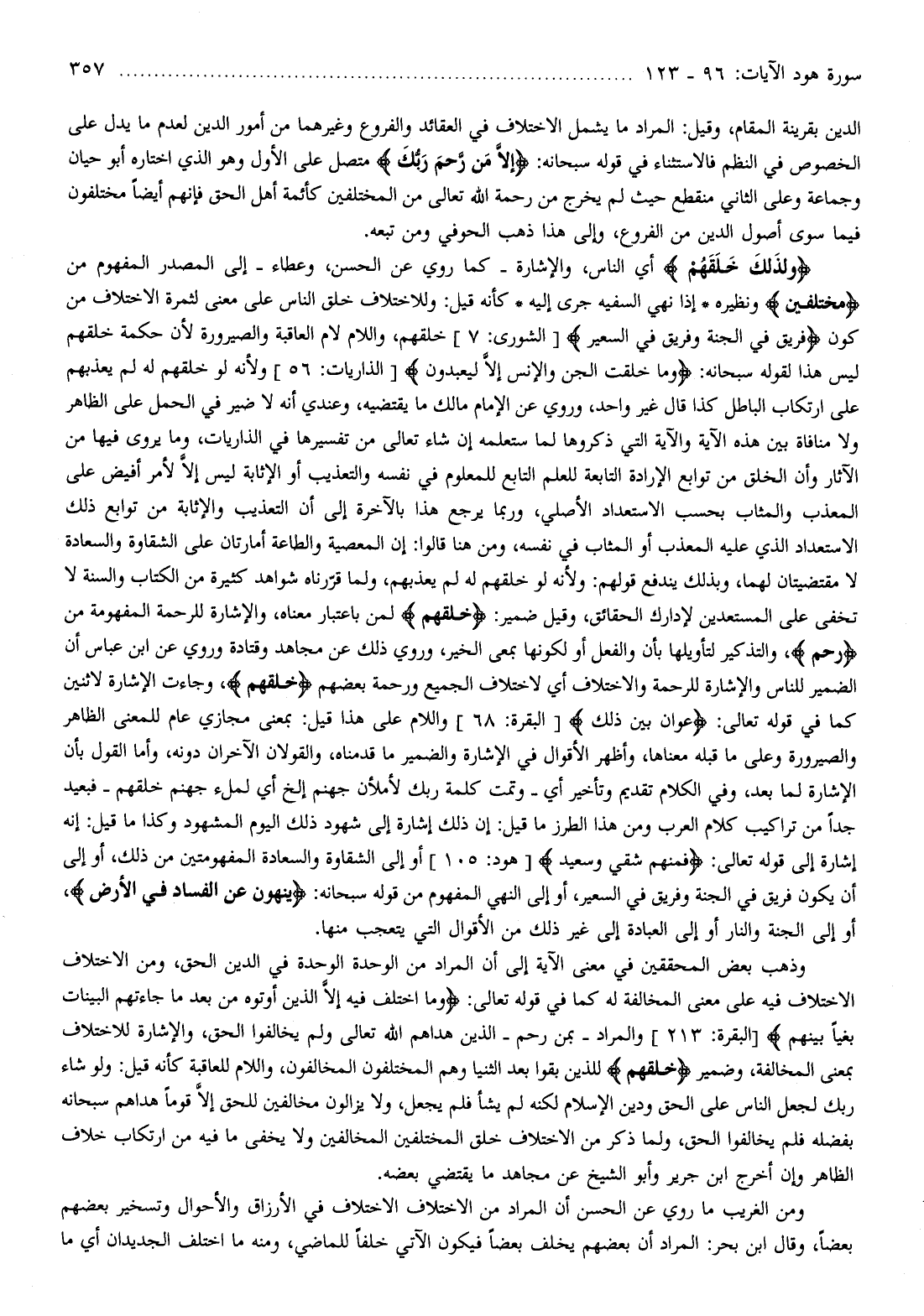 وَلِذلِكَ خَلَقَهُمْ أي الناس، والإشارة- كما روي عن الحسن، وعطاء- إلى المصدر المفهوم من مُخْتَلِفِينَ ونظيره إذا نهي السفيه جرى إليه كأنه قيل: وللاختلاف خلق الناس على معنى لثمرة الاختلاف من كون فَرِيقٌ فِي الْجَنَّةِ وَفَرِيقٌ فِي السَّعِيرِ [الشورى: 7] خلقهم، واللام لام العاقبة والصيرورة لأن حكمة خلقهم ليس هذا لقوله سبحانه: وَما خَلَقْتُ الْجِنَّ وَالْإِنْسَ إِلَّا لِيَعْبُدُونِ [الذاريات: 56] ولأنه لو خلقهم له لم يعذبهم على ارتكاب الباطل كذا قال غير واحد، وروي عن الإمام مالك ما يقتضيه، وعندي أنه لا ضير في الحمل على الظاهر ولا منافاة بين هذه الآية والآية التي ذكروها لما ستعلمه إن شاء تعالى من تفسيرها في الذاريات، وما يروى فيها من الآثار وأن الخلق من توابع الإرادة التابعة للعلم التابع للمعلوم في نفسه والتعذيب أو الإثابة ليس إلّا لأمر أفيض على المعذب والمثاب بحسب الاستعداد الأصلي، وربما يرجع هذا بالآخرة إلى أن التعذيب والإثابة من توابع ذلك الاستعداد الذي عليه المعذب أو المثاب في نفسه، ومن هنا قالوا: إن المعصية والطاعة أمارتان على الشقاوة والسعادة لا مقتضيتان لهما، وبذلك يندفع قولهم: ولأنه لو خلقهم له لم يعذبهم، ولما قرّرناه شواهد كثيرة من الكتاب والسنة لا تخفى على المستعدين لإدراك الحقائق، وقيل ضمير: خَلَقَهُمْ لمن باعتبار معناه، والإشارة للرحمة المفهومة من رَحِمَ، والتذكير لتأويلها بأن والفعل أو لكونها بمعنى الخير، وروي ذلك عن مجاهد وقتادة وروي عن ابن عباس أن الضمير للناس والإشارة للرحمة والاختلاف أي لاختلاف الجميع ورحمة بعضهم خَلَقَهُمْ، وجاءت الإشارة لاثنين كما في قوله تعالى: عَوانٌ بَيْنَ ذلِكَ [البقرة: 68] واللام على هذا قيل: بمعنى مجازي عام للمعنى الظاهر والصيرورة وعلى ما قبله معناها، وأظهر الأقوال في الإشارة والضمير ما قدمناه، والقولان الآخران دونه، وأما القول بأن الإشارة لما بعد، وفي الكلام تقديم وتأخير أي- وتمت كلمة ربك لأملأن جهنم إلخ أي لملء جهنم خلقهم- فبعيد جدا من تراكيب كلام العرب ومن هذا الطرز ما قيل: إن ذلك إشارة إلى شهود ذلك اليوم المشهود وكذا ما قيل: إنه إشارة إلى قوله تعالى: فَمِنْهُمْ شَقِيٌّ وَسَعِيدٌ [هود: 105] أو إلى الشقاوة والسعادة المفهومتين من ذلك، أو إلى أن يكون فريق في الجنة وفريق في السعير، أو إلى النهي المفهوم من قوله سبحانه: يَنْهَوْنَ عَنِ الْفَسادِ فِي الْأَرْضِ، أو إلى الجنة والنار أو إلى العبادة إلى غير ذلك من الأقوال التي يتعجب منها.