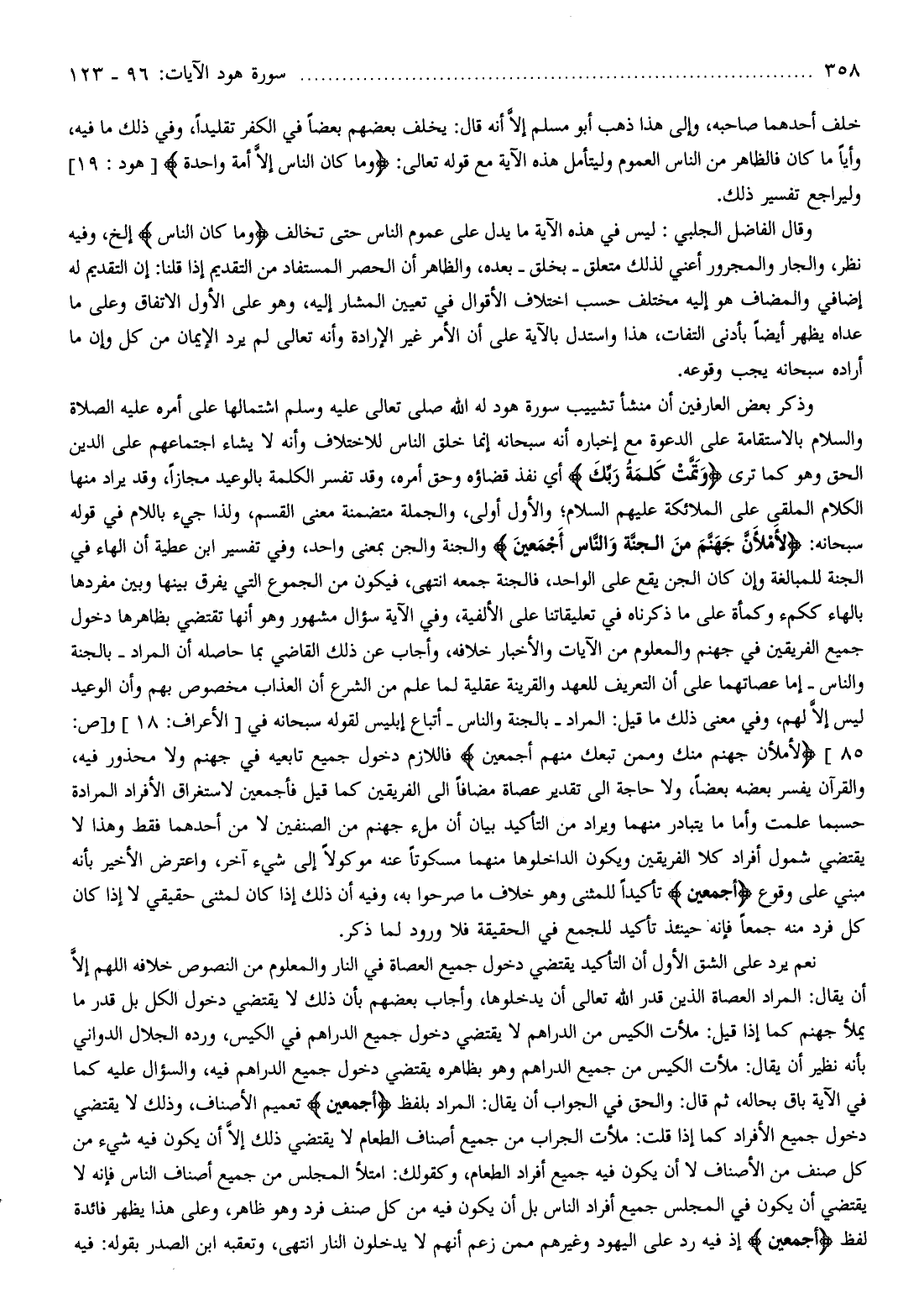 85] لَأَمْلَأَنَّ جَهَنَّمَ مِنْكَ وَمِمَّنْ تَبِعَكَ مِنْهُمْ أَجْمَعِينَ فاللازم دخول جميع تابعيه في جهنم ولا محذور فيه، والقرآن يفسر بعضه بعضا، ولا حاجة الى تقدير عصاة مضافا الى الفريقين كما قيل فأجمعين لاستغراق الأفراد المرادة حسبما علمت وأما ما يتبادر منهما ويراد من التأكيد بيان أن ملء جهنم من الصنفين لا من أحدهما فقط وهذا لا يقتضي شمول أفراد كلا الفريقين ويكون الداخلوها منهما مسكوتا عنه موكولا إلى شيء آخر، واعترض الأخير بأنه مبني على وقوع أَجْمَعِينَ تأكيدا للمثنى وهو خلاف ما صرحوا به، وفيه أن ذلك إذا كان لمثنى حقيقي لا إذا كان كل فرد منه جمعا فإنه حينئذ تأكيد للجمع في الحقيقة فلا ورود لما ذكر.