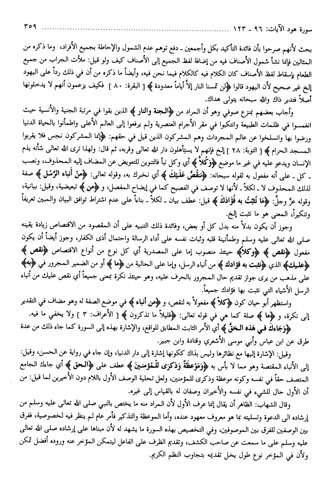 وأجاب بعضهم بمنزع صوفي وهو أن المراد من الجنة والنار الذين بقوا في مرتبة الجنية والإنسية حيث انغمسوا في ظلمات الطبيعة وانتكبوا في مقر الأجرام العنصرية ولم يرفعوا إلى العالم الأعلى واطمأنوا بالحياة الدنيا ورضوا بها وانسلخوا عن عالم المجردات وهم المشركون الذين قيل في حقهم: إِنَّمَا الْمُشْرِكُونَ نَجَسٌ فَلا يَقْرَبُوا الْمَسْجِدَ الْحَرامَ [التوبة: 28] إلخ فإنهم لا يستأهلون دار الله تعالى وقربه، ثم قال: ولهذا ترى الله تعالى شأنه يذم الإنسان ويدعو عليه في غير ما موضع وَكُلًّا أي وكل نبأ فالتنوين للتعويض عن المضاف إليه المحذوف، ونصب- كل- على أنه مفعول به لقوله سبحانه: نَقُصُّ عَلَيْكَ أي نخبرك به، وقوله تعالى: مِنْ أَنْباءِ الرُّسُلِ صفة لذلك المحذوف لا- لكلا- لأنها لا توصف في الفصيح كما في إيضاح المفصل، ومِنْ تبعيضية، وقيل: بيانية، وقوله عزّ وجلّ: ما نُثَبِّتُ بِهِ فُؤادَكَ قيل: عطف بيان- لكلا- بناء على عدم اشتراط توافق البيان والمبين تعريفا وتنكيرا، المعنى هو ما نثبت إلخ.