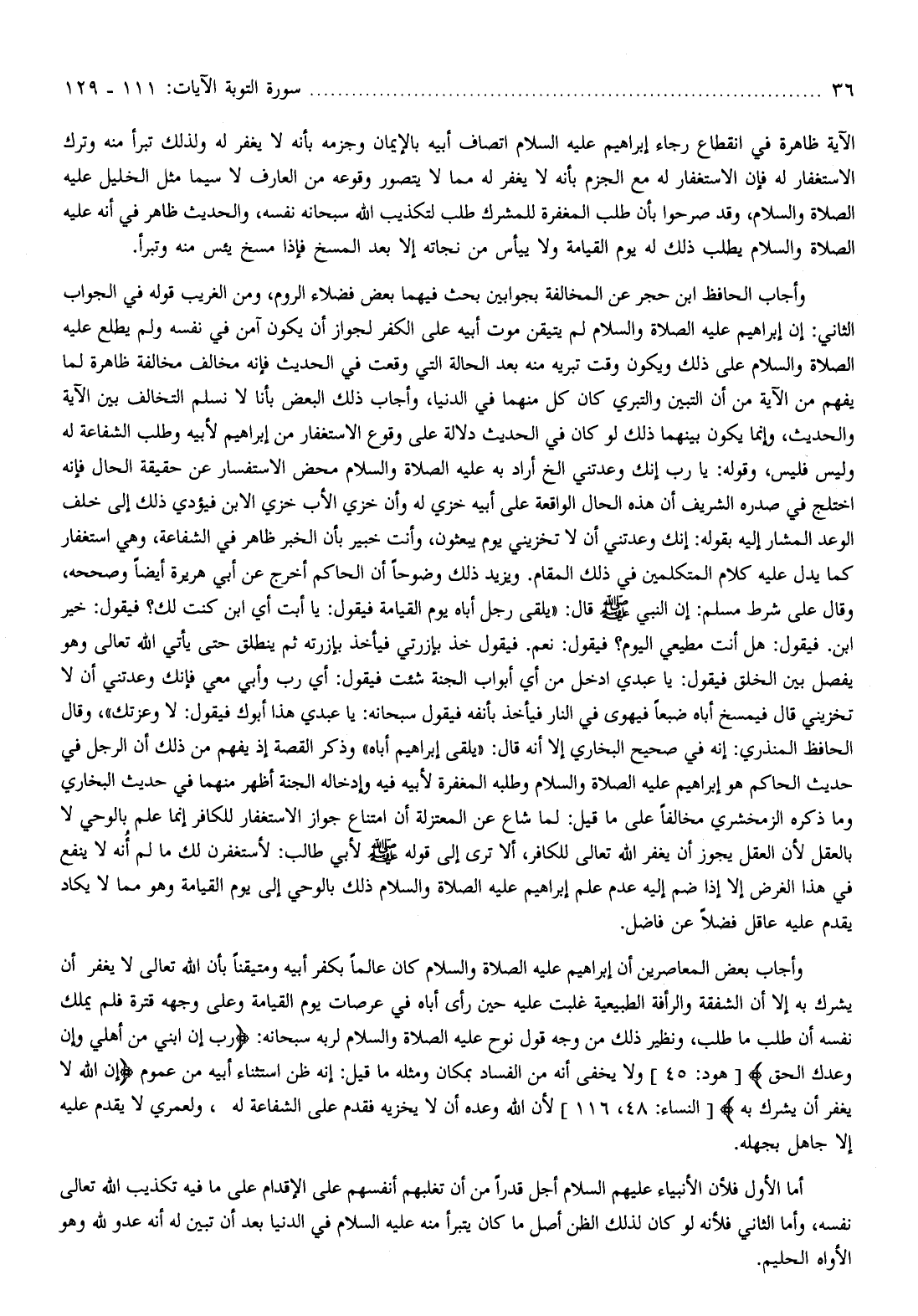 وأجاب الحافظ ابن حجر عن المخالفة بجوابين بحث فيهما بعض فضلاء الروم، ومن الغريب قوله في الجواب الثاني: إن إبراهيم عليه الصلاة والسلام لم يتيقن موت أبيه على الكفر لجواز أن يكون آمن في نفسه ولم يطلع عليه الصلاة والسلام على ذلك ويكون وقت تبريه منه بعد الحالة التي وقعت في الحديث فإنه مخالف مخالفة ظاهرة لما يفهم من الآية من أن التبين والتبري كان كل منهما في الدنيا، وأجاب ذلك البعض بأنا لا نسلم التخالف بين الآية والحديث، وإنما يكون بينهما ذلك لو كان في الحديث دلالة على وقوع الاستغفار من إبراهيم لأبيه وطلب الشفاعة له وليس فليس، وقوله: يا رب إنك وعدتني إلخ أراد به عليه الصلاة والسلام محض الاستفسار عن حقيقة الحال فإنه اختلج في صدره الشريف أن هذه الحال الواقعة على أبيه خزي له وأن خزي الأب خزي الابن فيؤدي ذلك إلى خلف الوعد المشار إليه بقوله: إنك وعدتني أن لا تخزيني يوم يبعثون، وأنت خبير بأن الخبر ظاهر في الشفاعة، وهي استغفار كما يدل عليه كلام المتكلمين في ذلك المقام. ويزيد ذلك وضوحا