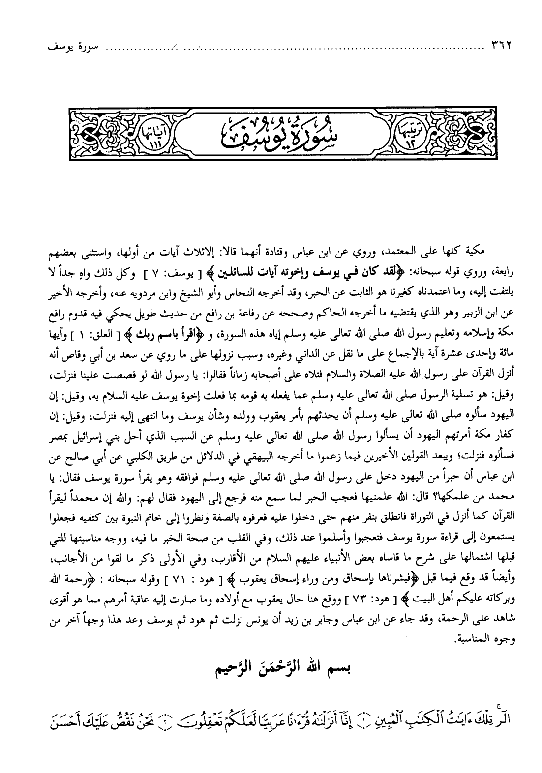 مكية كلها على المعتمد، وروي عن ابن عباس وقتادة أنهما قالا: إلا ثلاث آيات من أولها، واستثنى بعضهم رابعة، وروي قوله سبحانه: لَقَدْ كانَ فِي يُوسُفَ وَإِخْوَتِهِ آياتٌ لِلسَّائِلِينَ [يوسف: 7] وكل ذلك واه جدا لا يلتفت إليه، وما اعتمدناه كغيرنا هو الثابت عن الحبر، وقد أخرجه النحاس وأبو الشيخ وابن مردويه عنه، وأخرجه الأخير عن ابن الزبير وهو الذي يقتضيه ما أخرجه الحاكم وصححه عن رفاعة بن رافع من حديث طويل يحكي فيه قدوم رافع مكة وإسلامه وتعليم رسول الله صلى الله تعالى عليه وسلم إياه هذه السورة، واقْرَأْ بِاسْمِ رَبِّكَ [العلق: 1] وآيها مائة وإحدى عشرة آية بالإجماع على ما نقل عن الداني وغيره، وسبب نزولها على ما