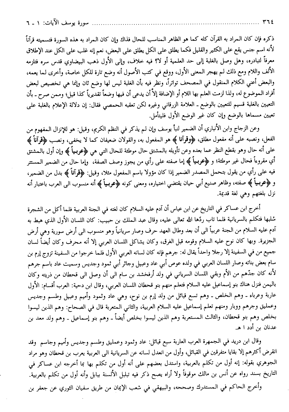 وعن الزجاج وابن الأنباري أن الضمير لنبأ يوسف وإن لم يذكر في النظم الكريم، وقيل: هو للإنزال المفهوم من الفعل، ونصبه على أنه مفعول مطلق، وَقُرْآناً هو المفعول به، والقولان ضعيفان كما لا يخفى، ونصب قُرْآناً على أنه حال وهو بقطع النظر عما بعده وعن تأويله بالمشتق حال موطئة للحال التي هي عَرَبِيًّا وإن أول بالمشتق أي مقروءا فحال غير موطئة وعَرَبِيًّا إما صفته على رأي من يجوز وصف الصفة، وإما حال من الضمير المستتر فيه على رأي من يقول بتحمل المصدر الضمير إذا كان مؤولا باسم المفعول مثلا، وقيل: قُرْآناً بدل من الضمير، وعَرَبِيًّا صفته، وظاهر صنيع أبي حيان يقتضي اختياره، ومعنى كونه عَرَبِيًّا أنه منسوب الى العرب باعتبار أنه نزل بلغتهم وهي لغة قديمة.