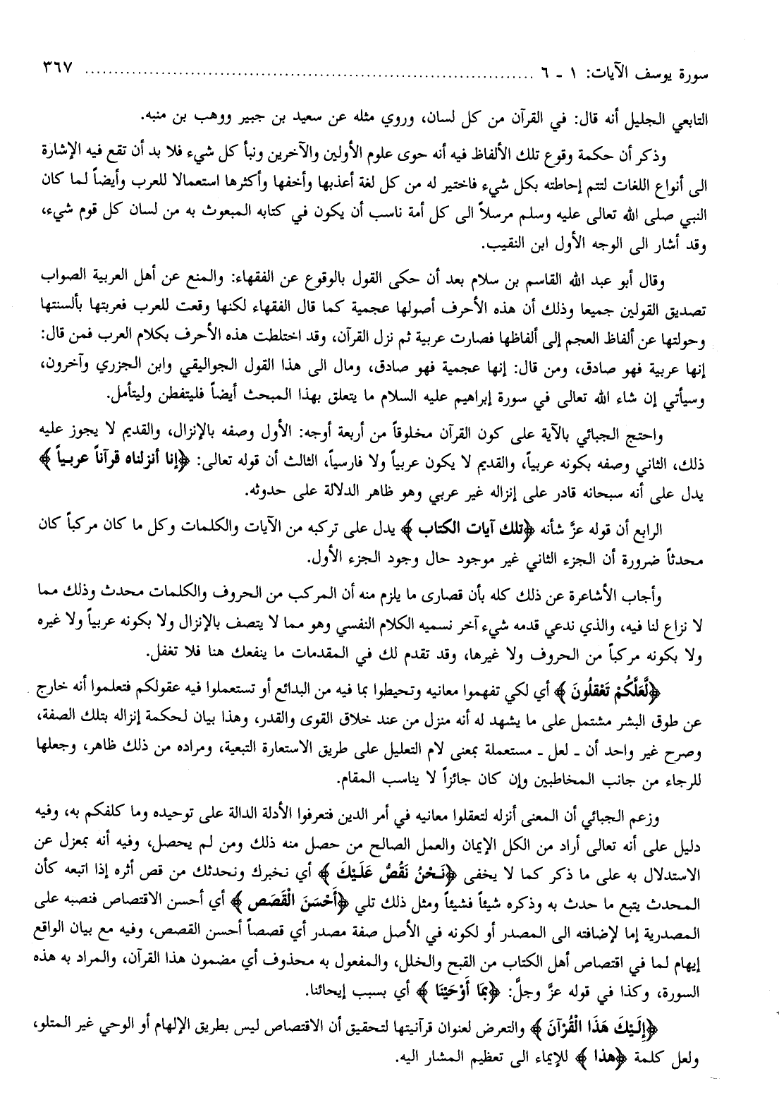 واحتج الجبائي بالآية على كون القرآن مخلوقا من أربعة أوجه: الأول وصفه بالإنزال، والقديم لا يجوز عليه ذلك، الثاني وصفه بكونه عربيا، والقديم لا يكون عربيا ولا فارسيا، الثالث أن قوله تعالى: إِنَّا أَنْزَلْناهُ قُرْآناً عَرَبِيًّا يدل على أنه سبحانه قادر على إنزاله غير عربي وهو ظاهر الدلالة على حدوثه.