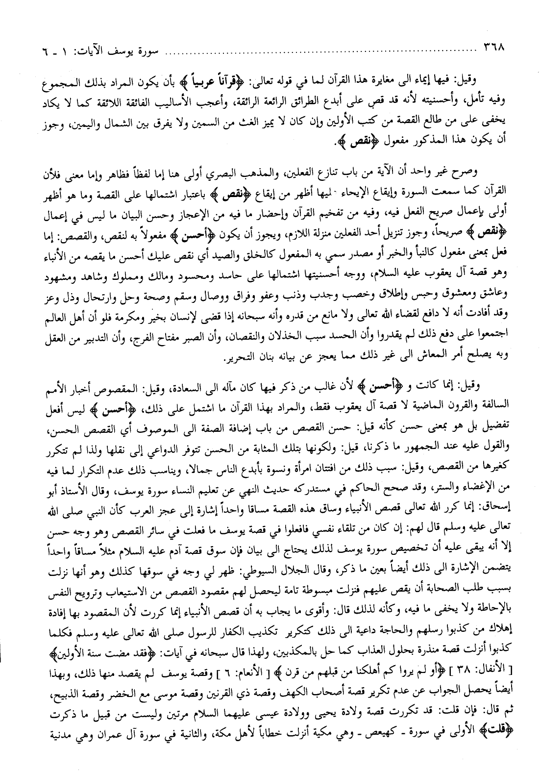 وقيل: إنما كانت وأَحْسَنَ لأن غالب من ذكر فيها كان مآله الى السعادة، وقيل: المقصوص أخبار الأمم السالفة والقرون الماضية لا قصة آل يعقوب فقط، والمراد بهذا القرآن ما اشتمل على ذلك، أَحْسَنَ ليس أفعل تفضيل بل هو بمعنى حسن كأنه قيل: حسن القصص من باب إضافة الصفة الى الموصوف أي القصص الحسن، والقول عليه عند الجمهور ما ذكرنا، قيل: ولكونها بتلك المثابة من الحسن تتوفر الدواعي إلى نقلها ولذا لم تتكرر كغيرها من القصص، وقيل: سبب ذلك من افتتان امرأة ونسوة بأبدع الناس جمالا، ويناسب ذلك عدم التكرار لما فيه من الإغضاء والستر، وقد صحح الحاكم في مستدركه حديث النهي عن تعليم النساء سورة يوسف، وقال الأستاذ أبو إسحاق: إنما كرر الله تعالى قصص الأنبياء وساق هذه القصة مساقا واحدا إشارة إلى عجز العرب كأن النبي صلى الله تعالى عليه وسلم قال لهم: إن كان من تلقاء نفسي فافعلوا في قصة يوسف ما فعلت في سائر القصص وهو وجه حسن إلا أنه يبقى عليه أن تخصيص سورة يوسف لذلك يحتاج الى بيان فإن سوق قصة آدم عليه السلام مثلا مساقا واحدا يتضمن الإشارة إلى ذلك أيضا بعين ما ذكر، وقال الجلال السيوطي: ظهر لي وجه في سوقها كذلك وهو أنها نزلت بسبب طلب الصحابة أن يقص عليهم فنزلت مبسوطة تامة ليحصل لهم مقصود القصص من الاستيعاب وترويح النفس بالإحاطة ولا يخفى ما فيه، وكأنه لذلك قال: وأقوى ما يجاب به أن قصص الأنبياء إنما كررت لأن المقصود بها إفادة إهلاك من كذبوا رسلهم والحاجة داعية الى ذلك كتكرير تكذيب الكفار للرسول صلى الله تعالى عليه وسلم فكلما كذبوا أنزلت قصة منذرة بحلول العذاب كما حل بالمكذبين، ولهذا قال سبحانه في آيات: فَقَدْ مَضَتْ سُنَّتُ الْأَوَّلِينَ [الأنفال: 38] أَلَمْ يَرَوْا كَمْ أَهْلَكْنا مِنْ قَبْلِهِمْ مِنْ قَرْنٍ [الأنعام: 6] وقصة يوسف لم يقصد منها ذلك، وبهذا أيضا يحصل الجواب عن عدم تكرير قصة أصحاب الكهف وقصة ذي القرنين وقصة موسى مع الخضر وقصة الذبيح، ثم قال: فإن قلت: قد تكررت قصة ولادة يحيى وولادة عيسى عليهما السلام مرتين وليست من قبيل ما ذكرت قلت الأولى في سورة- كهيعص- وهي مكية أنزلت خطابا لأهل مكة، والثانية في سورة آل عمران وهي مدنية