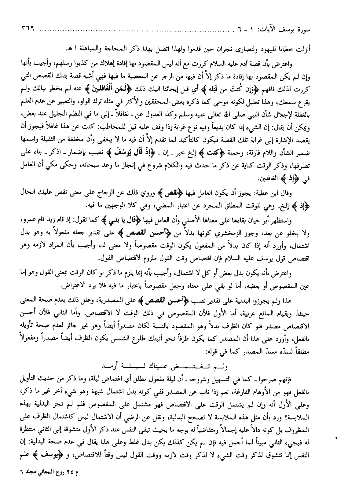 ولم تغتمض عيناك ليلة أرمد فإنهم صرحوا- كما في التسهيل وشروحه- أن ليلة مفعول مطلق أي اغتماض ليلة، وما ذكر من حديث التأويل بالفعل فهو من الأوهام الفارغة، نعم إذا ناب عن المصدر ففي كونه بدل اشتمال شبهة وهو شيء آخر غير ما ذكر، وعلى الأول أنه وإن لم يشتمل الوقت على الاقتصاص فهو مشتمل على المقصوص فلم لم تجز البدلية بهذه الملابسة؟ ورد بأن مثل هذه الملابسة لا تصحح البدلية، ونقل عن الرضي أن الاشتمال ليس كاشتمال الظرف على المظروف بل كونه دالّا عليه إجمالا ومتقاضيا له بوجه ما بحيث تبقى النفس عند ذكر الأول متشوقة إلى الثاني منتظرة له فيجيء الثاني مبينا لما أجمل فيه فإن لم يكن كذلك يكن بدل غلط وعلى هذا يقال في عدم صحة البدلية: إن النفس إنما تتشوق لذكر وقت الشيء لا لذكر وقت لازمه ووقت القول ليس وقتا للاقتصاص، ويُوسُفُ علم