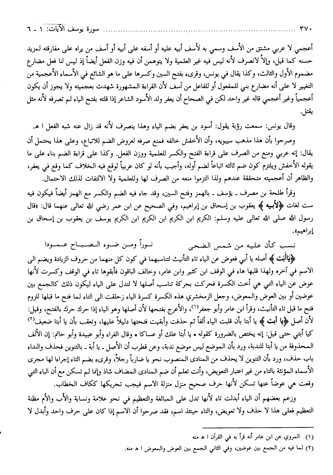 يا أَبَتِ أصله يا أبي فعوض عن الياء تاء التأنيث لتناسبهما في كون كل منهما من حروف الزيادة ويضم الى الاسم في آخره ولهذا قلبها هاء في الوقف ابن كثير وابن عامر، وخالف الباقون فأبقوها تاء في الوقف وكسرت لأنها عوض عن الياء التي هي أخت الكسرة فحركت بحركة تناسب أصلها لا لتدل على الياء ليكون ذلك كالجمع بين عوضين أو بين العوض والمعوض، وجعل الزمخشري هذه الكسرة كسرة الياء زحلقت الى التاء لما فتح ما قبلها للزوم فتح ما قبل تاء التأنيث، وقرأ ابن عامر وأبو جعفر (¬1) ، والأعرج بفتحها لأن أصلها وهو الياء إذا حرك حرك بالفتح، وقيل: