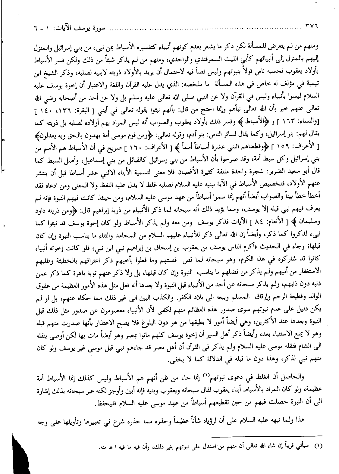 ومنهم من لم يتعرض للمسألة لكن ذكر ما يشعر بعدم كونهم أنبياء كتفسيره الأسباط بمن نبىء من بني إسرائيل والمنزل إليهم بالمنزل إلى أنبيائهم كأبي الليث السمرقندي والواحدي، ومنهم من لم يذكر شيئا من ذلك ولكن فسر الأسباط بأولاد يعقوب فحسبه ناس قولا بنبوتهم وليس نصا فيه لاحتمال أن يريد بالأولاد ذريته لابنيه لصلبه، وذكر الشيخ ابن تيمية في مؤلف له خاص في هذه المسألة ما ملخصه: الذي يدل عليه القرآن واللغة والاعتبار أن إخوة يوسف عليه السلام ليسوا بأنبياء وليس في القرآن ولا عن النبي صلى الله تعالى عليه وسلم بل ولا عن أحد من أصحابه رضي الله تعالى عنهم خبر بأن الله تعالى نبأهم وإنما احتج من قال: بأنهم نبئوا بقوله تعالى في آيتي [البقرة: 136، 140] [والنساء: 163] والْأَسْباطِ وفسر ذلك بأولاد يعقوب والصواب أنه ليس المراد بهم أولاده لصلبه بل ذريته كما يقال لهم: بنو إسرائيل، وكما يقال لسائر الناس: بنو آدم، وقوله تعالى: وَمِنْ قَوْمِ مُوسى أُمَّةٌ يَهْدُونَ بِالْحَقِّ وَبِهِ يَعْدِلُونَ [الأعراف: 159] وَقَطَّعْناهُمُ اثْنَتَيْ عَشْرَةَ أَسْباطاً أُمَماً [الأعراف: 160] صريح في أن الأسباط هم الأمم من بني إسرائيل وكل سبط أمة، وقد صرحوا بأن الأسباط من بني إسرائيل كالقبائل من بني إسماعيل، وأصل السبط كما قال أبو سعيد الضرير: شجرة واحدة ملتفة كثيرة الأغصان فلا معنى لتسمية الأبناء الاثني عشر أسباطا قبل أن ينتشر عنهم الأولاد، فتخصيص الأسباط في الآية ببنيه عليه السلام لصلبه غلط لا يدل عليه اللفظ ولا المعنى ومن ادعاه فقد أخطأ خطأ بينا والصواب أيضا أنهم إنما سموا أسباطا من عهد موسى عليه السلام، ومن حينئذ كانت فيهم النبوة فإنه لم يعرف فيهم نبي قبله إلا يوسف، ومما يؤيد ذلك أنه سبحانه لما ذكر الأنبياء من ذرية إبراهيم قال: وَمِنْ ذُرِّيَّتِهِ داوُدَ وَسُلَيْمانَ [الأنعام: 84] الآيات فذكر يوسف ومن معه ولم يذكر الأسباط ولو كان إخوة يوسف قد نبئوا كما نبىء لذكروا كما ذكر، وأيضا إن الله تعالى ذكر للأنبياء عليهم السلام من المحامد والثناء ما يناسب النبوة وإن كان قبلها وجاء
