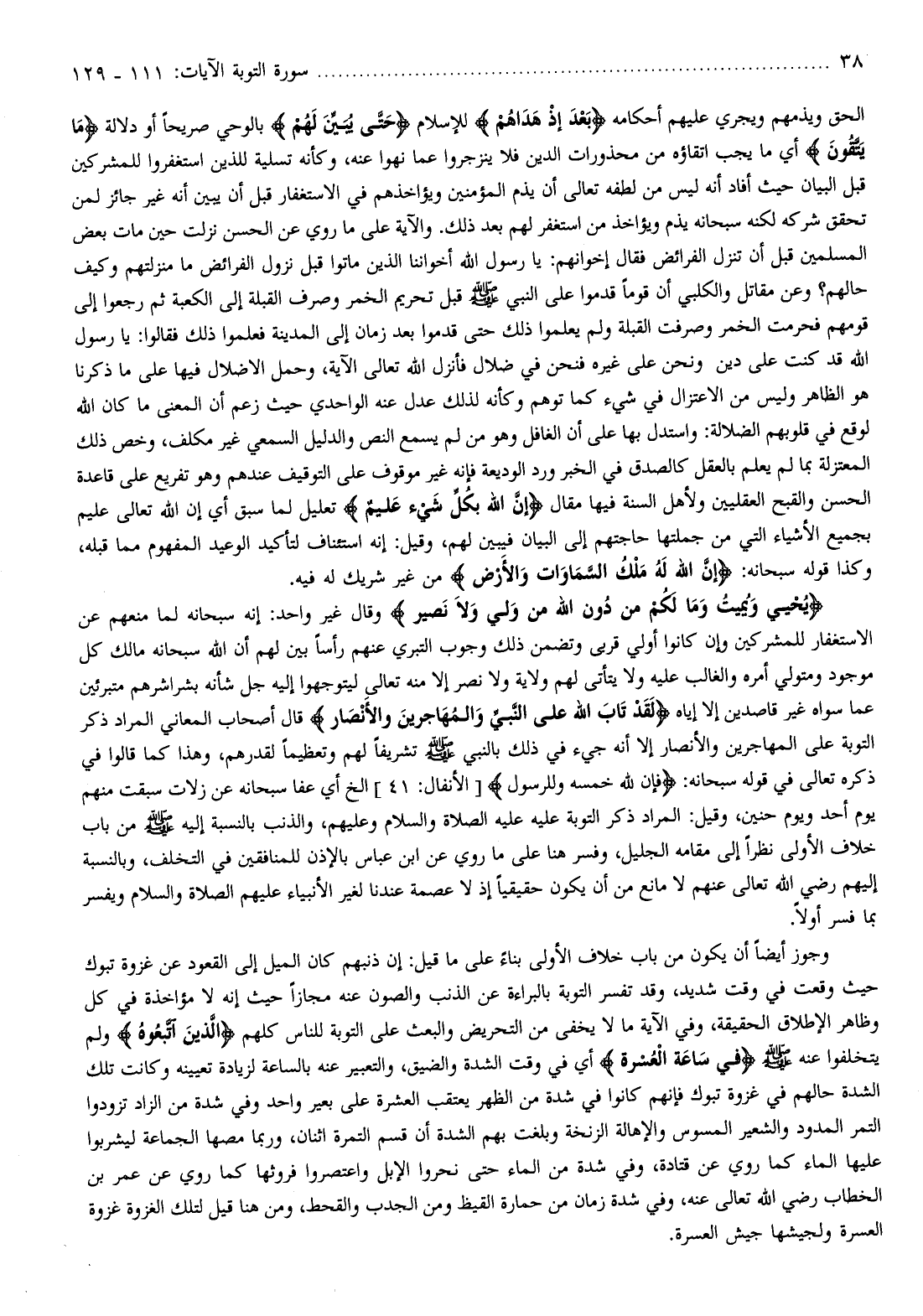 يُحْيِي وَيُمِيتُ وَما لَكُمْ مِنْ دُونِ اللَّهِ مِنْ وَلِيٍّ وَلا نَصِيرٍ وقال غير واحد: إنه سبحانه لما منعهم عن الاستغفار للمشركين وإن كانوا أولي قربى وتضمن ذلك وجوب التبري عنهم رأسا بين لهم أن الله سبحانه مالك كل موجود ومتولي أمره والغالب عليه ولا يتأتى لهم ولاية ولا نصر إلا منه تعالى ليتوجهوا إليه جل شأنه بشراشرهم متبرئين عما سواه غير قاصدين إلا إياه لَقَدْ تابَ اللَّهُ عَلَى النَّبِيِّ وَالْمُهاجِرِينَ وَالْأَنْصارِ قال أصحاب المعاني المراد ذكر التوبة على المهاجرين والأنصار إلا أنه جيء في ذلك بالنبي صلّى الله عليه وسلم تشريفا لهم وتعظيما لقدرهم، وهذا كما قالوا في ذكره تعالى في قوله سبحانه: فَأَنَّ لِلَّهِ خُمُسَهُ وَلِلرَّسُولِ [الأنفال: 41] إلخ أي عفا سبحانه عن زلات سبقت منهم يوم أحد ويوم حنين، وقيل: المراد ذكر التوبة عليه عليه الصلاة والسلام وعليهم، والذنب بالنسبة إليه صلّى الله عليه وسلم من باب خلاف الأولى نظرا إلى مقامه الجليل، وفسر هنا على ما روي عن ابن عباس بالإذن للمنافقين في التخلف، وبالنسبة إليهم رضي الله تعالى عنهم لا مانع من أن يكون حقيقيا إذ لا عصمة عندنا لغير الأنبياء عليهم الصلاة والسلام ويفسر بما فسر أولا.