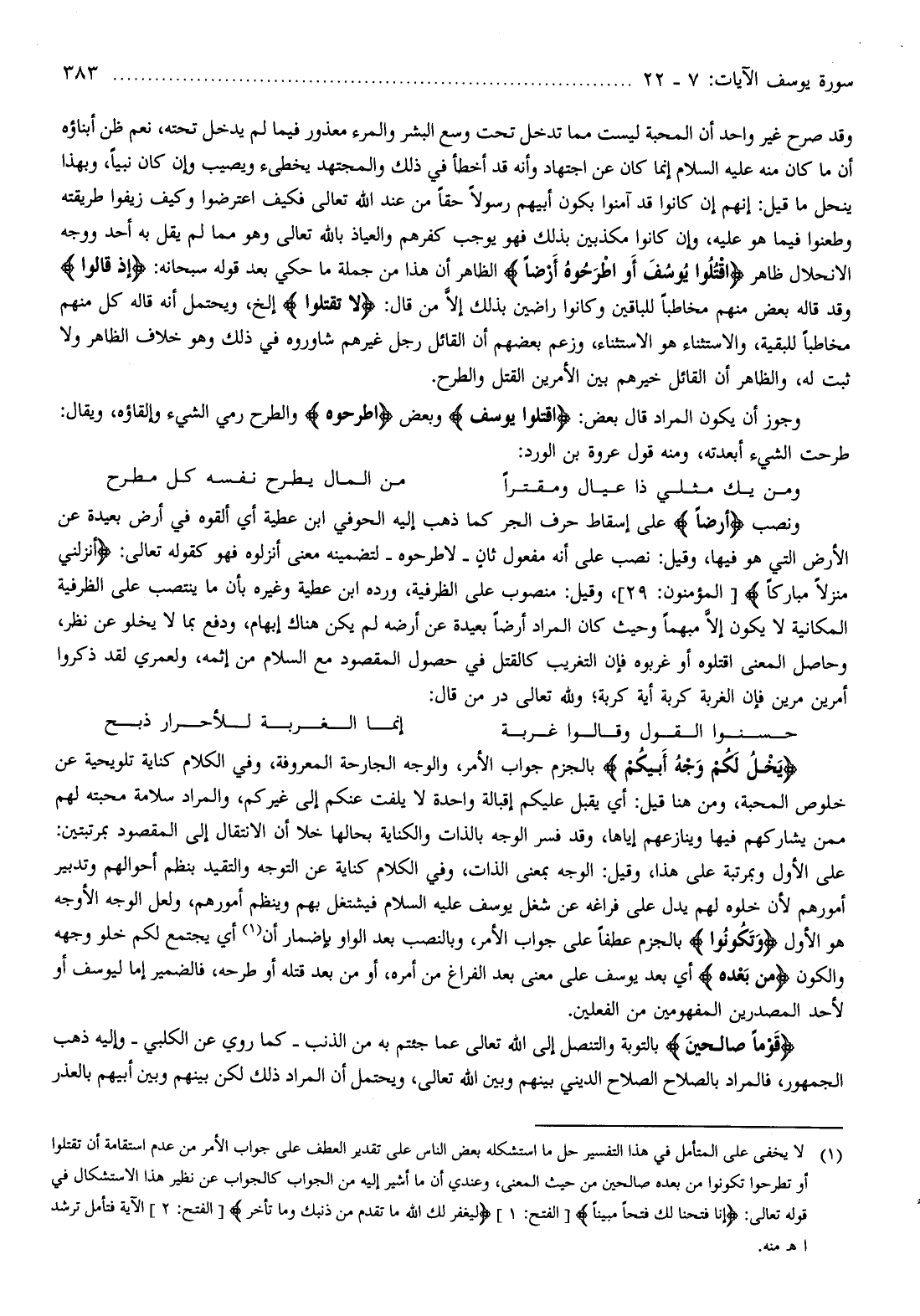 (¬1) لا يخفى على المتأمل في هذا التفسير حل ما استشكله بعض الناس على تقدير العطف على جواب الأمر من عدم استقامة أن تقتلوا أو تطرحوا تكونوا من بعده صالحين من حيث المعنى، وعندي أن ما أشير إليه من الجواب كالجواب عن نظير هذا الاستشكال في قوله تعالى: إِنَّا فَتَحْنا لَكَ فَتْحاً مُبِيناً [الفتح: 1] لِيَغْفِرَ لَكَ اللَّهُ ما تَقَدَّمَ مِنْ ذَنْبِكَ وَما تَأَخَّرَ [الفتح: 2] الآية فتأمل ترشد اهـ منه.