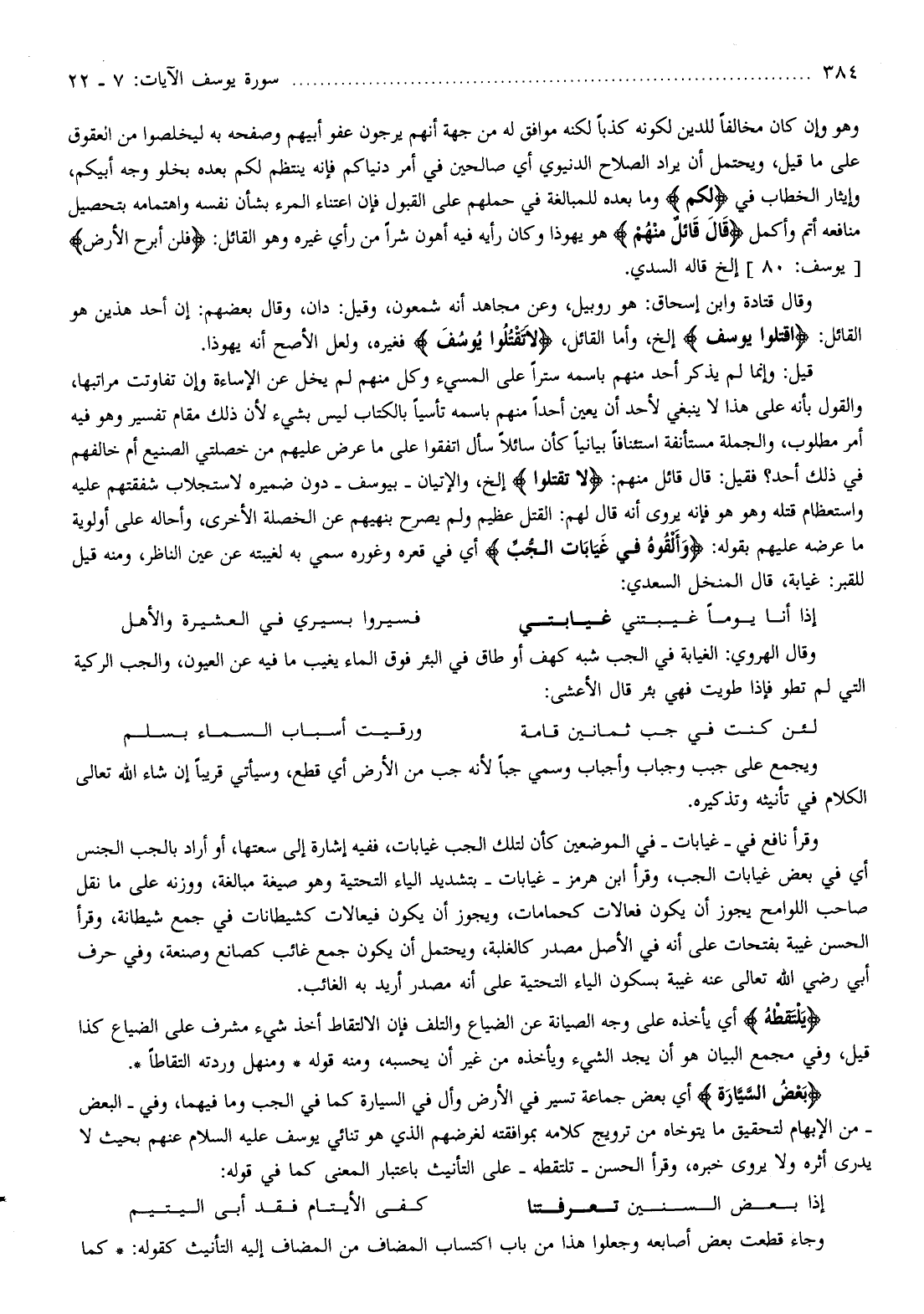 قيل: وإنما لم يذكر أحد منهم باسمه سترا على المسيء وكل منهم لم يخل عن الإساءة وإن تفاوتت مراتبها، والقول بأنه على هذا لا ينبغي لأحد أن يعين أحدا منهم باسمه تأسيا بالكتاب ليس بشيء لأن ذلك مقام تفسير وهو فيه أمر مطلوب، والجملة مستأنفة استئنافا بيانيا كأن سائلا سأل اتفقوا على ما عرض عليهم من خصلتي الصنيع أم خالفهم في ذلك أحد؟ فقيل: قال قائل منهم: لا تَقْتُلُوا إلخ، والإتيان- بيوسف- دون ضميره لاستجلاب شفقتهم عليه واستعظام قتله وهو هو فإنه يروى أنه قال لهم: القتل عظيم ولم يصرح بنهيهم عن الخصلة الأخرى، وأحاله على أولوية ما عرضه عليهم بقوله: وَأَلْقُوهُ فِي غَيابَتِ الْجُبِّ أي في قعره وغوره سمي به لغيبته عن عين الناظر، ومنه قيل للقبر: غيابة، قال المنخل السعدي: