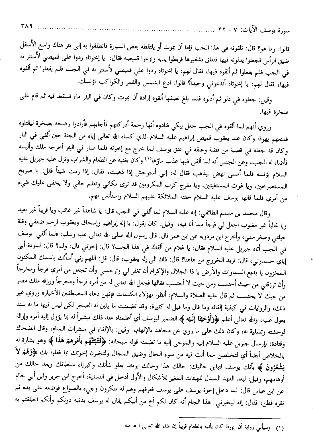 قالوا: وما هو؟ قال: تلقونه في هذا الجب فإما أن يموت أو يلتقطه بعض السيارة فانطلقوا به إلى بئر هناك واسع الأسفل ضيق الرأس فجعلوا يدلونه فيها فتعلق بشفيرها فربطوا يديه ونزعوا قميصه فقال: يا إخوتاه ردوا على قميصي لأستتر به في الجب فلم يفعلوا ثم ألقوه فيها، فقال لهم: يا إخوتاه ردوا علي قميصي لأستتر به في الجب فلم يفعلوا ثم ألقوه فيها، فقال لهم: يا إخوتاه أتدعوني وحيدا؟ قالوا: ادع الشمس والقمر والكواكب تؤنسك.