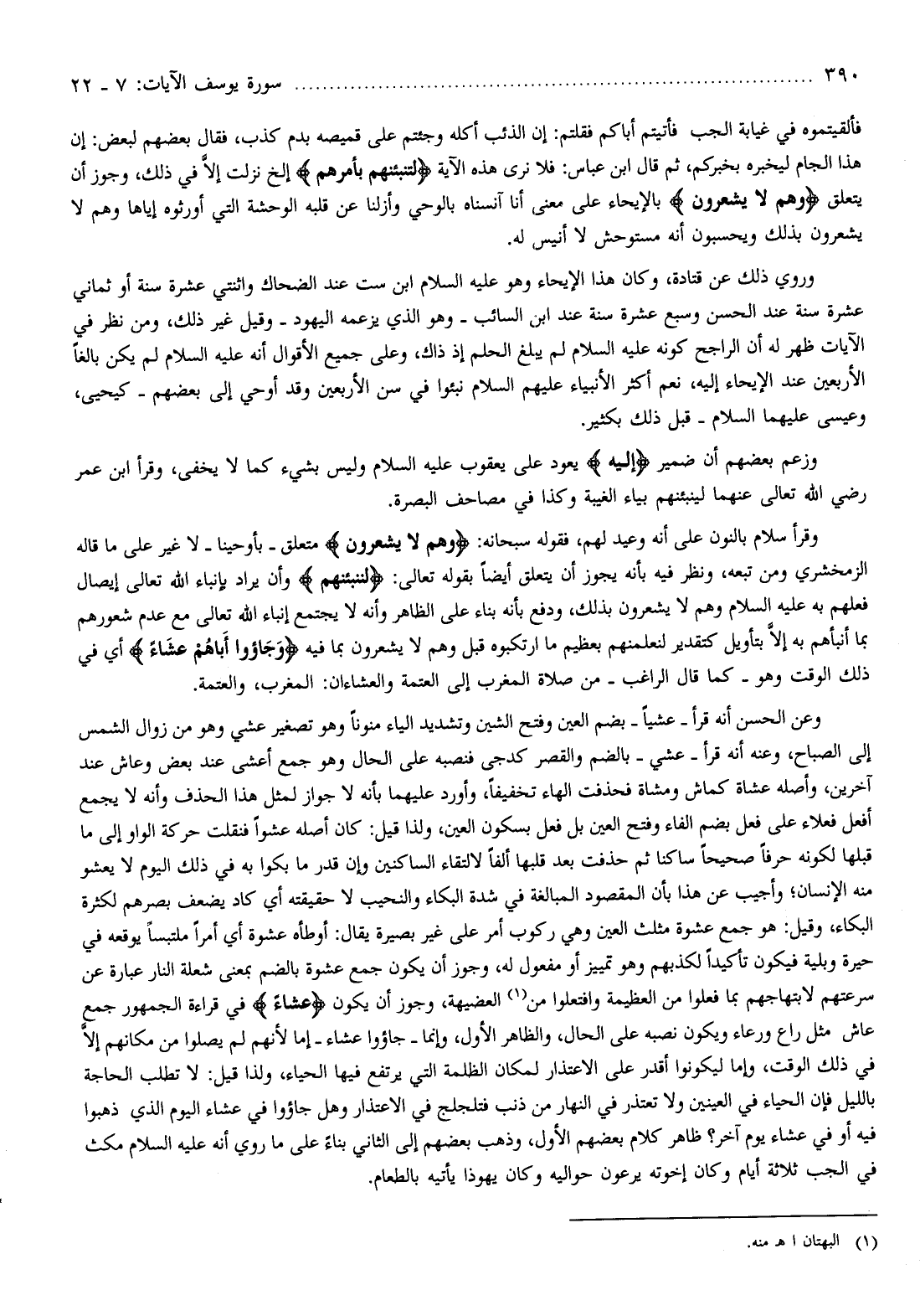 وقرأ سلام بالنون على أنه وعيد لهم، فقوله سبحانه: وَهُمْ لا يَشْعُرُونَ متعلق- بأوحينا- لا غير على ما قاله الزمخشري ومن تبعه، ونظر فيه بأنه يجوز أن يتعلق أيضا بقوله تعالى: لَتُنَبِّئَنَّهُمْ وأن يراد بإنباء الله تعالى إيصال فعلهم به عليه السّلام وهم لا يشعرون بذلك، ودفع بأنه بناء على الظاهر وأنه لا يجتمع إنباء الله تعالى مع عدم شعورهم بما أنبأهم به إلّا بتأويل كتقدير لنعلمنهم بعظيم ما ارتكبوه قبل وهم لا يشعرون بما فيه وَجاؤُ أَباهُمْ عِشاءً أي في ذلك الوقت وهو- كما قال الراغب- من صلاة المغرب إلى العتمة والعشاءان: المغرب، والعتمة.