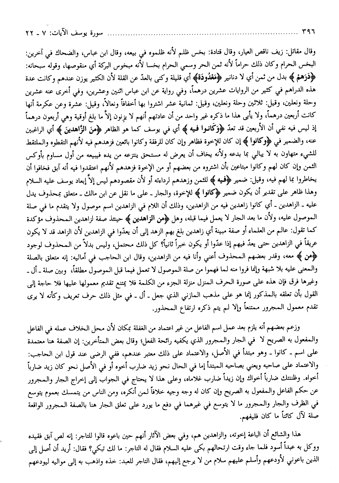 دَراهِمَ بدل من ثمن أي لا دنانير مَعْدُودَةٍ أي قليلة وكنى بالعدّ عن القلة لأن الكثير يوزن عندهم وكانت عدة هذه الدراهم في كثير من الروايات عشرين درهما، وفي رواية عن ابن عباس اثنين وعشرين، وفي أخرى عنه عشرين وحلة ونعلين، وقيل: ثلاثين وحلة ونعلين، وقيل: ثمانية عشر اشتروا بها أخفافا ونعالا، وقيل: عشرة وعن عكرمة أنها كانت أربعين درهما، ولا يأبى هذا ما ذكره غير واحد من أن عادتهم أنهم لا يزنون، إلّا ما بلغ أوقية وهي أربعون درهما إذ ليس فيه نفي أن الأربعين قد تعدّ وَكانُوا فِيهِ أي في يوسف كما هو الظاهر مِنَ الزَّاهِدِينَ أي الراغبين عنه، والضمير في وَكانُوا إن كان للإخوة فظاهر وإن كان للرفقة وكانوا بائعين فزهدهم فيه لأنهم التقطوه والملتقط للشيء متهاون به لا يبالي بما بدعه ولأنه يخاف أن يعرض له مستحق ينتزعه من يده فيبيعه من أول مساوم بأوكس الثمن وإن كان لهم وكانوا مبتاعين بأن اشتروه من بعضهم أو من الإخوة فزهدهم لأنهم اعتقدوا فيه أنه آبق فخافوا أن يخاطروا بما لهم فيه، وقيل: ضمير فِيهِ للثمن وزهدهم لرداءته أو لأن مقصودهم ليس إلّا إبعاد يوسف عليه السّلام وهذا ظاهر على تقدير أن يكون ضمير كانُوا للإخوة، والجار- على ما نقل عن ابن مالك- متعلق بمحذوف يدل عليه- الزاهدين- أي كانوا زاهدين فيه من الزاهدين، وذلك أن اللام في الزاهدين اسم موصول ولا يتقدم ما في صلة الموصول عليه، ولأن ما بعد الجار لا يعمل فيما قبله، وهل مِنَ الزَّاهِدِينَ حينئذ صفة لزاهدين المحذوف مؤكدة كما تقول: عالم من العلماء أو صفة مبينة أي زاهدين بلغ بهم الزهد إلى أن يعدّوا في الزاهدين لأن الزاهد قد لا يكون عريقا في الزاهدين حتى يعدّ فيهم إذا عدّوا أو يكون خبرا ثانيا؟ كل ذلك محتمل، وليس بدلا من المحذوف لوجود مِنَ معه، وقدر بعضهم المحذوف أعني وأنا فيه من الزاهدين، وقال ابن الحاجب في أماليه: إنه متعلق بالصلة والمعنى عليه بلا شبهة وإنما فروا منه لما فهموا من صلة الموصول لا تعمل فيما قبل الموصول مطلقا، وبين صلة- أل- وغيرها فرق فإن هذه على صورة الحرف المنزل منزلة الجزء من الكلمة فلا يمتنع تقديم معمولها عليها فلا حاجة إلى القول بأن تعلقه بالمذكور إنما هو على مذهب المازني الذي جعل- أل- في مثل ذلك حرف تعريف وكأنه لا يرى تقدم معمول المجرور ممتنعا وإلا لم يتم ذكره ارتفاع المحذور.