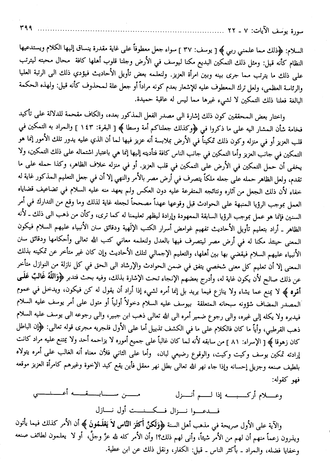واختار بعض المحققين كون ذلك إشارة الى مصدر الفعل المذكور بعده، والكاف مقحمة للدلالة على تأكيد فخامة شأن المشار اليه على ما ذكروا في وَكَذلِكَ جَعَلْناكُمْ أُمَّةً وَسَطاً [البقرة: 143] والمراد به التمكين في قلب العزيز أو في منزله وكون ذلك تمكينا في الأرض بملابسة أنه عزيز فيها لما أن الذي عليه يدور تلك الأمور إنما هو التمكين في جانب العزيز وأما التمكين في جانب الناس كافة فتأديته إليها إنما هي باعتبار اشتماله على ذلك التمكين، ولا يخفى أن حمل التمكين في الأرض على التمكين في قلب العزيز. أو في منزله خلاف الظاهر، وكذا حمله على ما تقدم، ولعل الظاهر حمله على جعله ملكا يتصرف في أرض مصر بالأمر والنهي إلا أن في جعل التعليم المذكور غاية له خفاء لأن ذلك الجعل من آثاره ونتائجه المتفرعة عليه دون العكس ولم يعهد منه عليه السّلام في تضاعيف قضاياه العمل بموجب الرؤيا المنبهة على الحوادث قبل وقوعها عهدا مصححا لجعله غاية لذلك وما وقع من التدارك في أمر السنين فإنما هو عمل بموجب الرؤيا السابقة المعهودة وإرادة ليظهر تعليمنا له كما ترى، وكأن من ذهب إلى ذلك- لأنه الظاهر- أراد بتعليم تأويل الأحاديث تفهيم غوامض أسرار الكتب الإلهية ودقائق سنن الأنبياء عليهم السّلام فيكون المعنى حينئذ مكنا له في أرض مصر ليتصرف فيها بالعدل ولنعلمه معاني كتب الله تعالى وأحكامها ودقائق سنن الأنبياء عليهم السّلام فيقضي بها بين أهلها، والتعليم الإجمالي لتلك الأحاديث وإن كان غير متأخر عن تمكينه بذلك المعنى إلا أن تعليم كل معنى شخصي يتفق في ضمن الحوادث والإرشاد الى الحق في كل نازلة من النوازل متأخر عن ذلك صالح لأن يكون غاية له، وأدرج بعضهم الإنجاء تحت الإشارة بذلك، وفيه بحث فتدبر وَاللَّهُ غالِبٌ عَلى أَمْرِهِ لا يمنع عما يشاء ولا ينازع فيما يريد بل إنما أمره لشيء إذا أراد أن يقول له كن فيكون، ويدخل في عموم المصدر المضاف شؤونه سبحانه المتعلقة بيوسف عليه السّلام دخولا أوليا أو متول على أمر يوسف عليه السّلام فيدبره ولا يكله إلى غيره، والى رجوع ضمير أمره الى الله تعالى ذهب ابن جبير، والى رجوعه الى يوسف عليه السّلام ذهب القرطبي، وأيا ما كان فالكلام على ما في الكشف تذييل أما على الأول فلجريه مجرى قوله تعالى: إِنَّ الْباطِلَ كانَ زَهُوقاً [الإسراء: 81] من سابقه لأنه لما كان غالبا على جميع أموره لا يزاحمه أحد ولا يمتنع عليه مراد كانت إرادته تمكين يوسف وكيت وكيت، والوقوع رضيعي لبان، وأما على الثاني فلأن معناه أنه الغالب على أمره يتولاه بلطيف صنعه وجزيل إحسانه وإذا جاء نهر الله تعالى بطل نهر معقل فأين يقع كيد الإخوة وغيرهم كامرأة العزيز موقعه فهو كقوله: