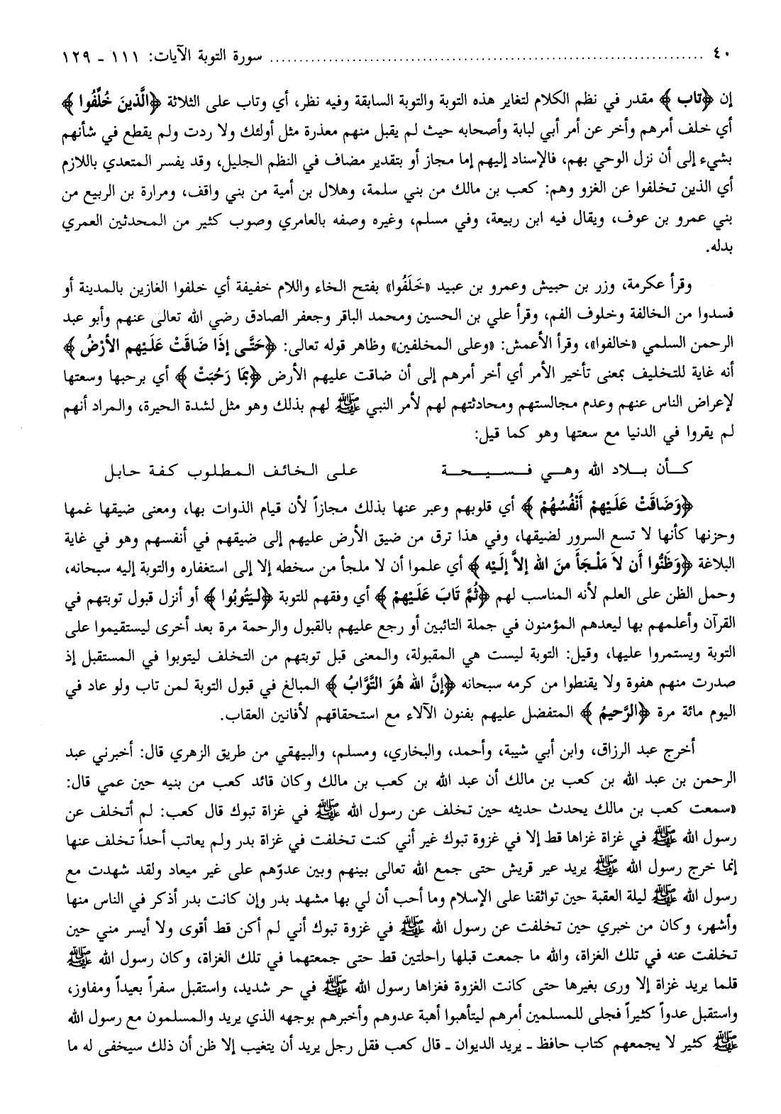 إن تابَ مقدر في نظم الكلام لتغاير هذه التوبة والتوبة السابقة وفيه نظر، أي وتاب على الثلاثة الَّذِينَ خُلِّفُوا أي خلف أمرهم وأخر عن أمر أبي لبابة وأصحابه حيث لم يقبل منهم معذرة مثل أولئك ولا ردت ولم يقطع في شأنهم بشيء إلى أن نزل الوحي بهم، فالإسناد إليهم إما مجاز أو بتقدير مضاف في النظم الجليل، وقد يفسر المتعدي باللازم أي الذين تخلفوا عن الغزو وهم: كعب بن مالك من بني سلمة، وهلال بن أمية من بني واقف، ومرارة بن الربيع من بني عمرو بن عوف، ويقال فيه ابن ربيعة، وفي مسلم، وغيره وصفه بالعامري وصوب كثير من المحدثين العمري بدله.