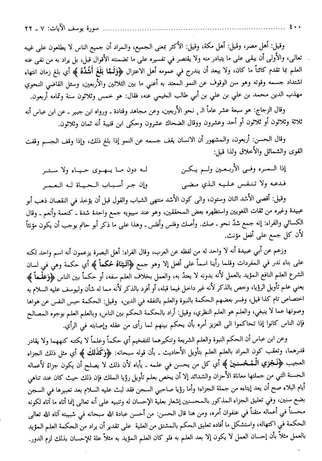 وقيل: أهل مصر، وقيل: أهل مكة، وقيل: الأكثر بمعنى الجميع، والمراد أن جميع الناس لا يطلعون على غيبه تعالى، والأولى أن يبقى على ما يتبادر منه ولا يقتصر في تفسيره على ما تضمنته الأقوال قبل، بل يراد به من نفى عنه العلم بما تقدم كائنا ما كان، ولا يبعد أن يندرج في عمومه أهل الاعتزال وَلَمَّا بَلَغَ أَشُدَّهُ أي بلغ زمان انتهاء اشتداد جسمه وقوته وهو سن الوقوف عن النمو المعتد به أعني ما بين الثلاثين والأربعين، وسئل القاضي النحوي مهذب الدين محمد بن علي بن علي بن أبي طالب الخيمي عنه، فقال: هو خمس وثلاثون سنة وتمامه أربعون.