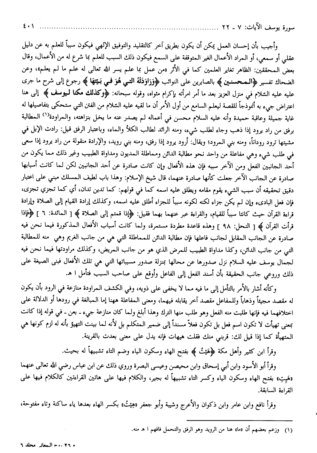 وعن الضحاك تفسير الْمُحْسِنِينَ بالصابرين على النوائب وَراوَدَتْهُ الَّتِي هُوَ فِي بَيْتِها رجوع إلى شرح ما جرى عليه عليه السّلام في منزل العزيز بعد ما أمر امرأته بإكرام مثواه، وقوله سبحانه: وَكَذلِكَ مَكَّنَّا لِيُوسُفَ إلى هنا اعتراض جيء به أنموذجا للقصة ليعلم السامع من أول الأمر أن ما لقيه عليه السّلام من الفتن التي ستحكى بتفاصيلها له غاية جميلة وعاقبة حميدة وأنه عليه السلام محسن في أعماله لم يصدر عنه ما يخل بنزاهته، والمراودة (¬1) المطالبة برفق من راد يرود إذا ذهب وجاء لطلب شيء، ومنه الرائد لطالب الكلأ والماء، وباعتبار الرفق قيل: رادت الإبل في مشيتها ترود رودانا، ومنه بني المرود ويقال: أرود يرود إذا رفق، ومنه بني رويد، والإرادة منقولة من راد يرود إذا سعى في طلب شيء وهي مفاعلة من واحد نحو مطالبة الدائن ومماطلة المديون ومداواة الطبيب وغير ذلك مما يكون من أحد الجانبين الفعل ومن الآخر سببه فإن هذه الأفعال وإن كانت صادرة عن أحد الجانبين لكن لما كانت أسبابها صادرة عن الجانب الآخر جعلت كأنها صادرة عنهما، قال شيخ الإسلام: وهذا باب لطيف المسلك مبني على اعتبار دقيق تحقيقه أن سبب الشيء يقوم مقامه ويطلق عليه اسمه كما في قولهم: كما تدين تدان، أي كما تجزي تجزى، فإن فعل البادئ وإن لم يكن جزاء لكنه لكونه سببا للجزاء أطلق عليه اسمه، وكذلك إرادة القيام إلى الصلاة وإرادة قراءة القرآن حيث كانتا سببا للقيام، والقراءة عبر عنهما بهما فقيل: إِذا قُمْتُمْ إِلَى الصَّلاةِ [المائدة: 6] فَإِذا قَرَأْتَ الْقُرْآنَ [النحل: 98] وهذه قاعدة مطردة مستمرة، ولما كانت أسباب الأفعال المذكورة فيما نحن فيه صادرة عن الجانب المقابل لجانب فاعلها فإن مطالبة الدائن للمماطلة التي هي من جانب الغريم وهي منه للمطالبة التي من جانب الدائن، وكذا مداواة الطبيب للمرض الذي هو من جانب المريض، وكذلك مراودتها فيما نحن فيه لجمال يوسف عليه السلام نزل صدورها عن محالها بمنزلة صدور مسبباتها التي هي تلك الأفعال فبنى الصيغة على ذلك وروعي جانب الحقيقة بأن أسند الفعل إلى الفاعل وأوقع على صاحب السبب فتأمل اهـ.