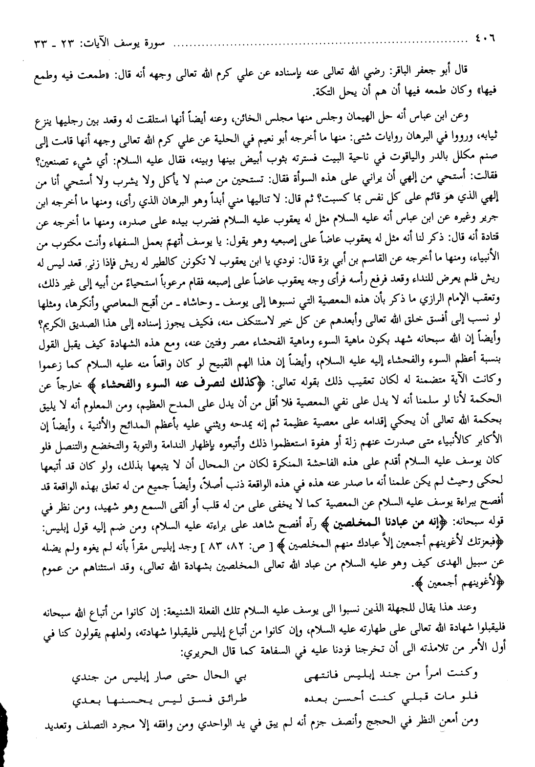 وأيضا إن الله سبحانه شهد بكون ماهية السوء وماهية الفحشاء مصروفتين عنه، ومع هذه الشهادة كيف يقبل القول بنسبة أعظم السوء والفحشاء إليه عليه السلام، وأيضا إن هذا الهم القبيح لو كان واقعا منه عليه السلام كما زعموا وكانت الآية متضمنة له لكان تعقيب ذلك بقوله تعالى: كَذلِكَ لِنَصْرِفَ عَنْهُ السُّوءَ وَالْفَحْشاءَ خارجا عن الحكمة لأنا لو سلمنا أنه لا يدل على نفي المعصية فلا أقل من أن يدل على المدح العظيم، ومن المعلوم أنه لا يليق بحكمة الله تعالى أن يحكي إقدامه على معصية عظيمة ثم إنه يمدحه ويثني عليه بأعظم المدائح والأثنية، وأيضا إن الأكابر كالأنبياء متى صدرت عنهم زلة أو هفوة استعظموا ذلك وأتبعوه بإظهار الندامة والتوبة والتخضع والتنصل فلو كان يوسف عليه السلام أقدم على هذه الفاحشة المنكرة لكان من المحال أن لا يتبعها بذلك، ولو كان قد أتبعها لحكى وحيث لم يكن علمنا أنه ما صدر عنه هذه في هذه الواقعة ذنب أصلا، وأيضا جميع من له تعلق بهذه الواقعة قد أفصح ببراءة يوسف عليه السلام عن المعصية كما لا يخفى على من له قلب أو ألقى السمع وهو شهيد، ومن نظر في قوله سبحانه: إِنَّهُ مِنْ عِبادِنَا الْمُخْلَصِينَ رآه أفصح شاهد على براءته عليه السلام، ومن ضم إليه قول إبليس:
