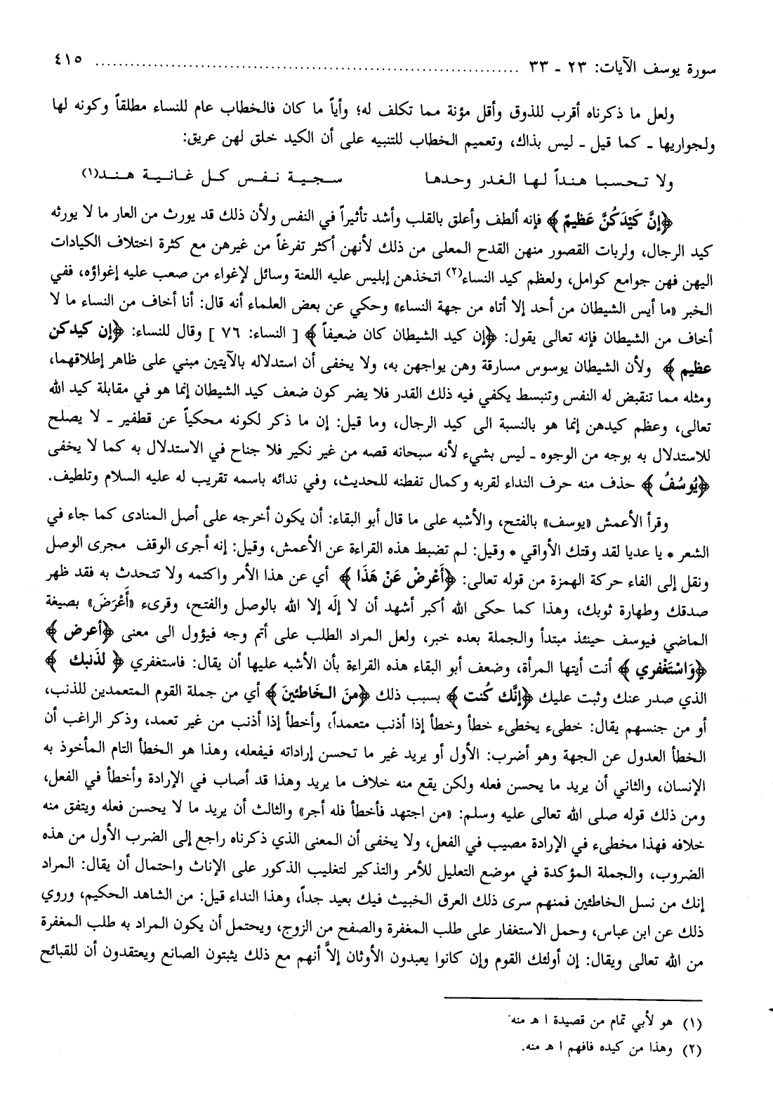 وحكي عن بعض العلماء أنه قال: أنا أخاف من النساء ما لا أخاف من الشيطان فإنه تعالى يقول: إِنَّ كَيْدَ الشَّيْطانِ كانَ ضَعِيفاً [النساء: 76] وقال للنساء: إِنَّ كَيْدَكُنَّ عَظِيمٌ ولأن الشيطان يوسوس مسارقة وهن يواجهن به، ولا يخفى أن استدلاله بالآيتين مبني على ظاهر إطلاقهما، ومثله مما تنقبض له النفس وتنبسط يكفي فيه ذلك القدر فلا يضر كون ضعف كيد الشيطان إنما هو في مقابلة كيد الله تعالى، وعظم كيدهن إنما هو بالنسبة الى كيد الرجال، وما قيل: إن ما ذكر لكونه محكيا عن قطفير- لا يصلح للاستدلال به بوجه من الوجوه- ليس بشيء لأنه سبحانه قصه من غير نكير فلا جناح في الاستدلال به كما لا يخفى يُوسُفُ حذف منه حرف النداء لقربه وكمال تفطنه للحديث، وفي ندائه باسمه تقريب له عليه السلام وتلطيف.