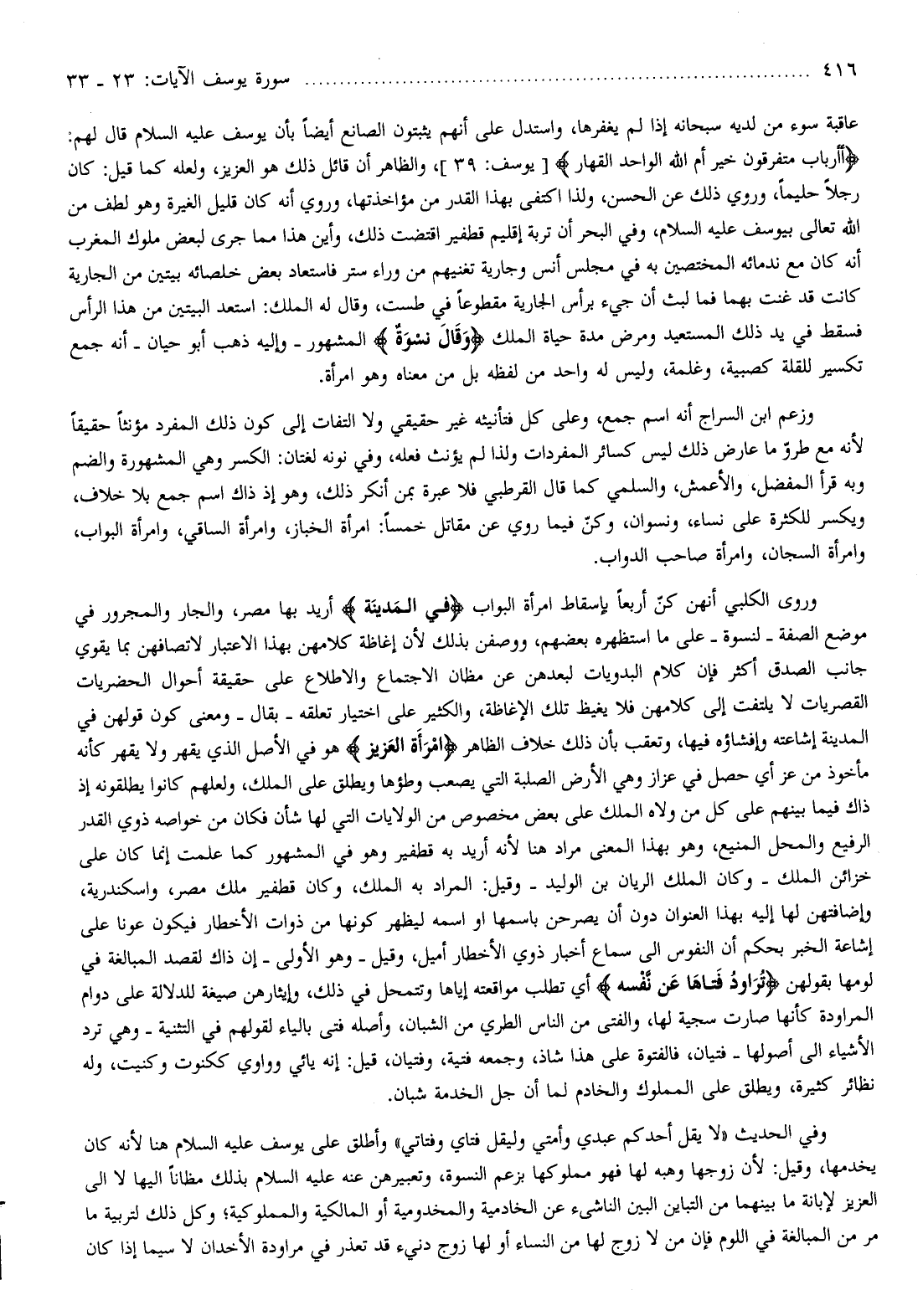 وروى الكلبي أنهن كنّ أربعا بإسقاط امرأة البواب فِي الْمَدِينَةِ أريد بها مصر، والجار والمجرور في موضع الصفة- لنسوة- على ما استظهره بعضهم، ووصفن بذلك لأن إغاظة كلامهن بهذا الاعتبار لا تصافهن بما يقوي جانب الصدق أكثر فإن كلام البدويات لبعدهن عن مظان الاجتماع والاطلاع على حقيقة أحوال الحضريات القصريات لا يلتفت إلى كلامهن فلا يغيظ تلك الإغاظة، والكثير على اختيار تعلقه- بقال- ومعنى كون قولهن في المدينة إشاعته وإفشاؤه فيها، وتعقب بأن ذلك خلاف الظاهر امْرَأَتُ الْعَزِيزِ هو في الأصل الذي يقهر ولا يقهر كأنه مأخوذ من عز أي حصل في عزاز وهي الأرض الصلبة التي يصعب وطؤها ويطلق على الملك، ولعلهم كانوا يطلقونه إذ ذاك فيما بينهم على كل من ولاه الملك على بعض مخصوص من الولايات التي لها شأن فكان من خواصه ذوي القدر الرفيع والمحل المنيع، وهو بهذا المعنى مراد هنا لأنه أريد به قطفير وهو في المشهور كما علمت إنما كان على خزائن الملك- وكان الملك الريان بن الوليد- وقيل: المراد به الملك، وكان قطفير ملك مصر، واسكندرية، وإضافتهن لها إليه بهذا العنوان دون أن يصرحن باسمها او اسمه ليظهر كونها من ذوات الأخطار فيكون عونا على إشاعة الخبر بحكم أن النفوس الى سماع أخبار ذوي الأخطار أميل، وقيل- وهو الأولى- إن ذاك لقصد المبالغة في لومها بقولهن تُراوِدُ فَتاها عَنْ نَفْسِهِ أي تطلب مواقعته إياها وتتمحل في ذلك، وإيثارهن صيغة للدلالة على دوام المراودة كأنها صارت سجية لها، والفتى من الناس الطري من الشبان، وأصله فتى بالياء لقولهم في التثنية- وهي ترد الأشياء الى أصولها- فتيان، فالفتوة على هذا شاذ، وجمعه فتية، وفتيان، قيل: إنه يائي وواوي ككنوت وكنيت، وله نظائر كثيرة، ويطلق على المملوك والخادم لما أن جل الخدمة شبان.