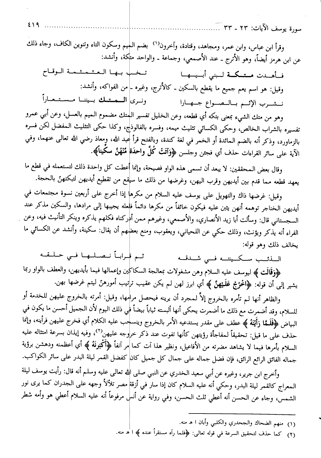 وقيل: غرضها ذاك والتهويل على يوسف عليه السّلام من مكرها إذا أخرج على أربعين نسوة مجتمعات في أيديهن الخناجر توهمه أنهن يثبن عليه فيكون خائفا من مكرها دائما فلعله يجيبها إلى مرادها، والسكين مذكر عند السجستاني قال: وسألت أبا زيد الأنصاري، والأصمعي، وغيرهم ممن أدركناه فكلهم يذكره وينكر التأنيث فيه، وعن الفراء أنه يذكر ويؤنث، وذلك حكي عن اللحياني، ويعقوب، ومنع بعضهم أن يقال: سكينة، وأنشد عن الكسائي ما يخالف ذلك وهو قوله: