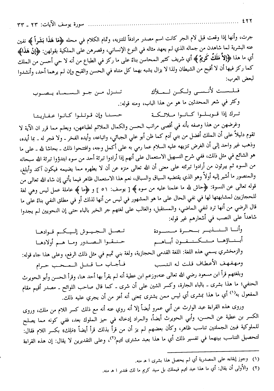وغرضهن من هذا وصفه بأنه في أقصى مراتب الحسن والكمال الملائم لطباعهن، ويعلم مما قرر ان الآية لا تقوم دليلا على أن الملك أفضل من بني آدم كما ظن أبو علي الجبائي، واتباعه، وأيده الفخر- ولا فجر له- بما أيده، وذهب غير واحد إلى أن الغرض تنزيهه عليه السلام عما رمي به على أكمل وجه، وافتتحوا ذلك- بحاشا لله- على ما هو الشائع في مثل ذلك، ففي شرح التسهيل الاستعمال على أنهم إذا أرادوا تبرئة أحد من سوء ابتدؤوا تبرئة الله سبحانه من السوء ثم يبرئون من أرادوا تبرئته على معنى أن الله تعالى منزه عن أن لا يطهره مما يضيمه فيكون آكد وأبلغ، والمنصور ما أشير إليه أولا وهو الذي يقتضيه السياق والسباق، نعم هذا الاستعمال ظاهر فيما يأتي إن شاء الله تعالى من قوله تعالى عن النسوة: حاشَ لِلَّهِ ما عَلِمْنا عَلَيْهِ مِنْ سُوءٍ [يوسف: 51] وما عاملة عمل ليس وهي لغة للحجازيين لمشابهتها لها في نفي الحال على ما هو المشهور في ليس من أنها لذلك أو في مطلق النفي بناء على ما قال الرضي من أنها ترد لنفي الماضي، والمستقبل، والغالب على لغتهم جر الخبر بالباء حتى إن النحويين لم يجدوا شاهدا على النصب في أشعارهم غير قوله: