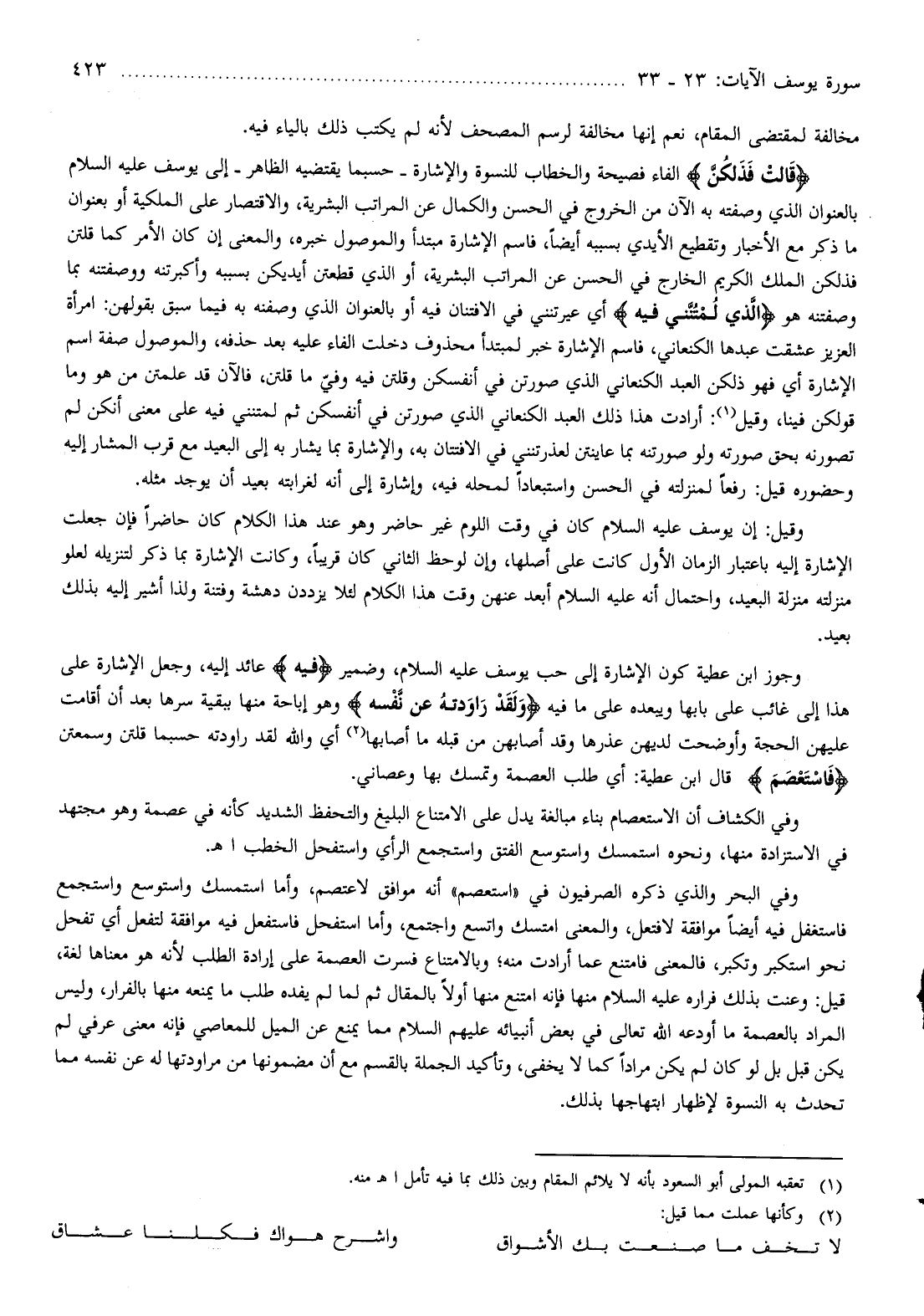 وجوز ابن عطية كون الإشارة إلى حب يوسف عليه السلام، وضمير فِيهِ عائد إليه، وجعل الإشارة على هذا إلى غائب على بابها ويبعده على ما فيه وَلَقَدْ راوَدْتُهُ عَنْ نَفْسِهِ وهو إباحة منها ببقية سرها بعد أن أقامت عليهن الحجة وأوضحت لديهن عذرها وقد أصابهن من قبله ما أصابها (¬2) أي والله لقد راودته حسبما قلتن وسمعتن فَاسْتَعْصَمَ قال ابن عطية: أي طلب العصمة وتمسك بها وعصاني.