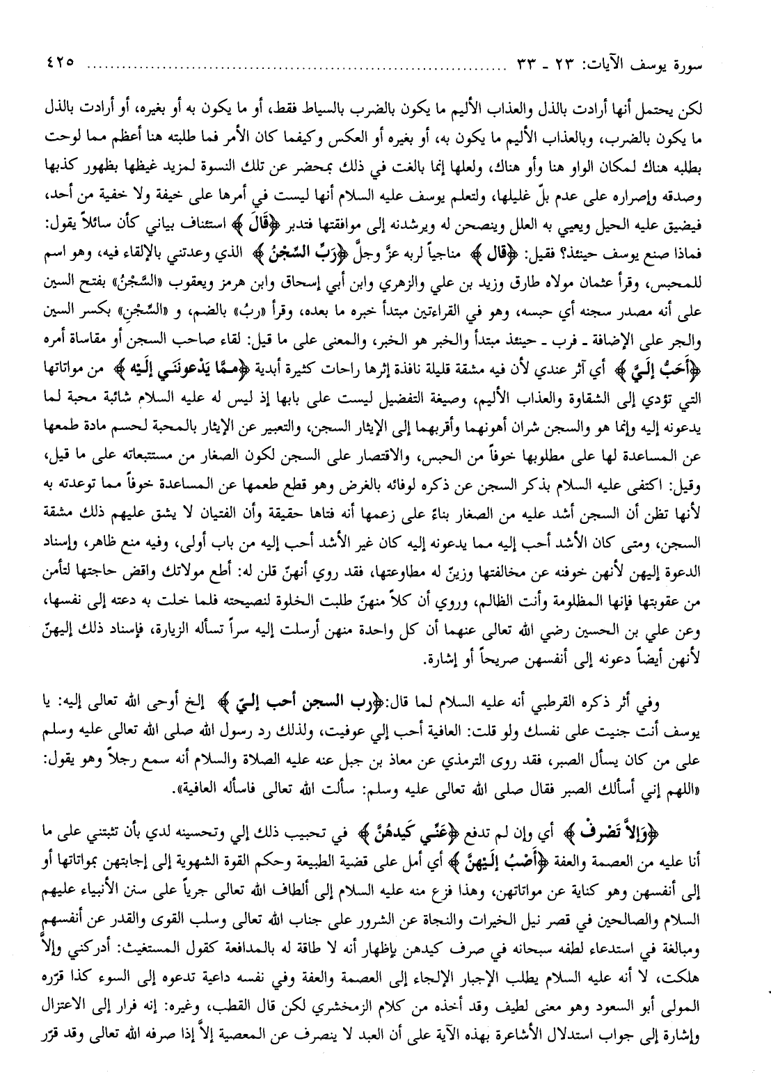 فماذا صنع يوسف حينئذ؟ فقيل: قالَ مناجيا لربه عزّ وجلّ رَبِّ السِّجْنُ الذي وعدتني بالإلقاء فيه، وهو اسم للمحبس، وقرأ عثمان مولاه طارق وزيد بن علي والزهري وابن أبي إسحاق وابن هرمز ويعقوب «السّجن» بفتح السين على أنه مصدر سجنه أي حبسه، وهو في القراءتين مبتدأ خبره ما بعده، وقرأ «ربّ» بالضم، و «السّجن» بكسر السين والجر على الإضافة- فرب- حينئذ مبتدأ والخبر هو الخبر، والمعنى على ما قيل: لقاء صاحب السجن أو مقاساة أمره أَحَبُّ إِلَيَّ أي آثر عندي لأن فيه مشقة قليلة نافذة إثرها راحات كثيرة أبدية مِمَّا يَدْعُونَنِي إِلَيْهِ من مواتاتها التي تؤدي إلى الشقاوة والعذاب الأليم، وصيغة التفضيل ليست على بابها إذ ليس له عليه السلام شائبة محبة لما يدعونه إليه وإنما هو والسجن شران أهونهما وأقربهما إلى الإيثار السجن، والتعبير عن الإيثار بالمحبة لحسم مادة طمعها عن المساعدة لها على مطلوبها خوفا من الحبس، والاقتصار على السجن لكون الصغار من مستتبعاته على ما قيل، وقيل: اكتفى عليه السلام بذكر السجن عن ذكره لوفائه بالغرض وهو قطع طمعها عن المساعدة خوفا مما توعدته به لأنها تظن أن السجن أشد عليه من الصغار بناء على زعمها أنه فتاها حقيقة وأن الفتيان لا يشق عليهم ذلك مشقة السجن، ومتى كان الأشد أحب إليه مما يدعونه إليه كان غير الأشد أحب إليه من باب أولى، وفيه منع ظاهر، وإسناد الدعوة إليهن لأنهن خوفنه عن مخالفتها وزيّن له مطاوعتها، فقد روي أنهنّ قلن له: أطع مولاتك واقض حاجتها لتأمن من عقوبتها فإنها المظلومة وأنت الظالم، وروي أن كلّا منهنّ طلبت الخلوة لنصيحته فلما خلت به دعته إلى نفسها،